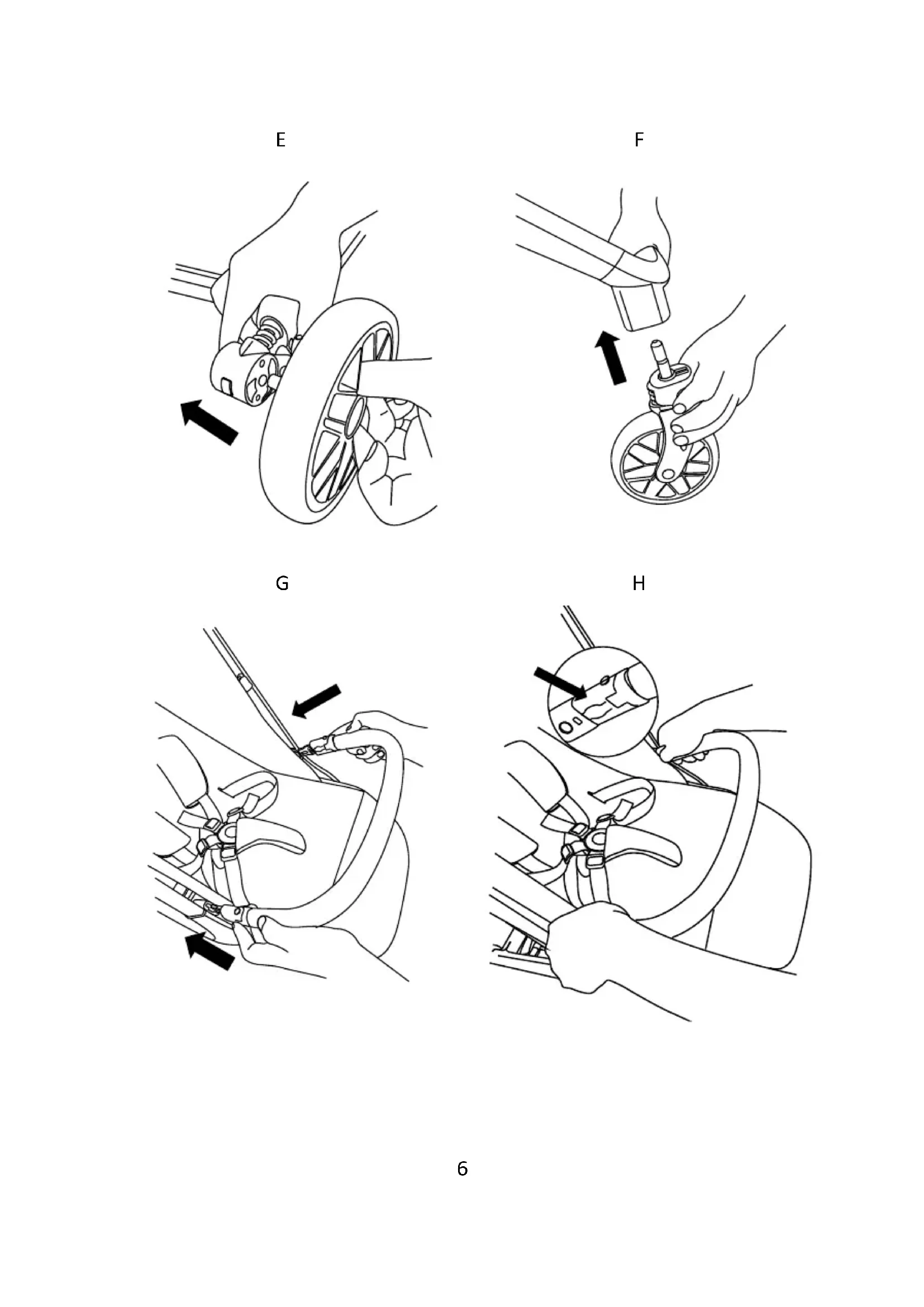 Place the frame on a flat surface with the handle directed upwards (PIC. A). To unfold the stroller, begin by pressing the parent handle to the stroller’s frame to make all elements strictly adhere to each other, and then press the lock button located on a handle (PIC. B.I), simultaneously pressing the fold button (PIC. B.II) and lift the frame up according to the arrows on the picture (PIC. C), until hearing a lock sound (PIC. D). Slide in the rear wheels (10) into the designated slots until you hear a lock sound (PIC. E). Slide in the front wheels (7) into the designated slots until you hear a lock sound (PIC. F).