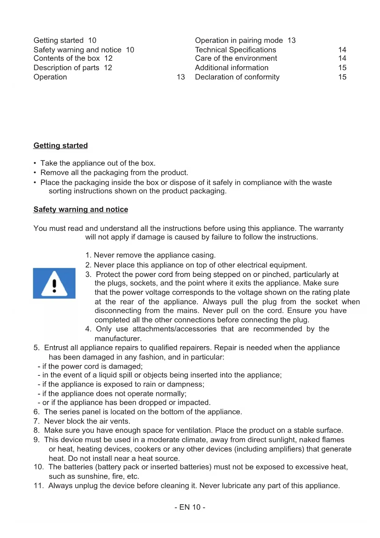 Getting started 10 Safety warning and notice 10 Contents of the box 12 Description of parts 12 Operation 13 Operation in pairing mode 13 Technical Specications 14 Care of the environment 14 Additional information 15 Declaration of conformity 15- EN 11 - Clean it with a soft cloth. Do not use abrasive products or harsh cleaners.