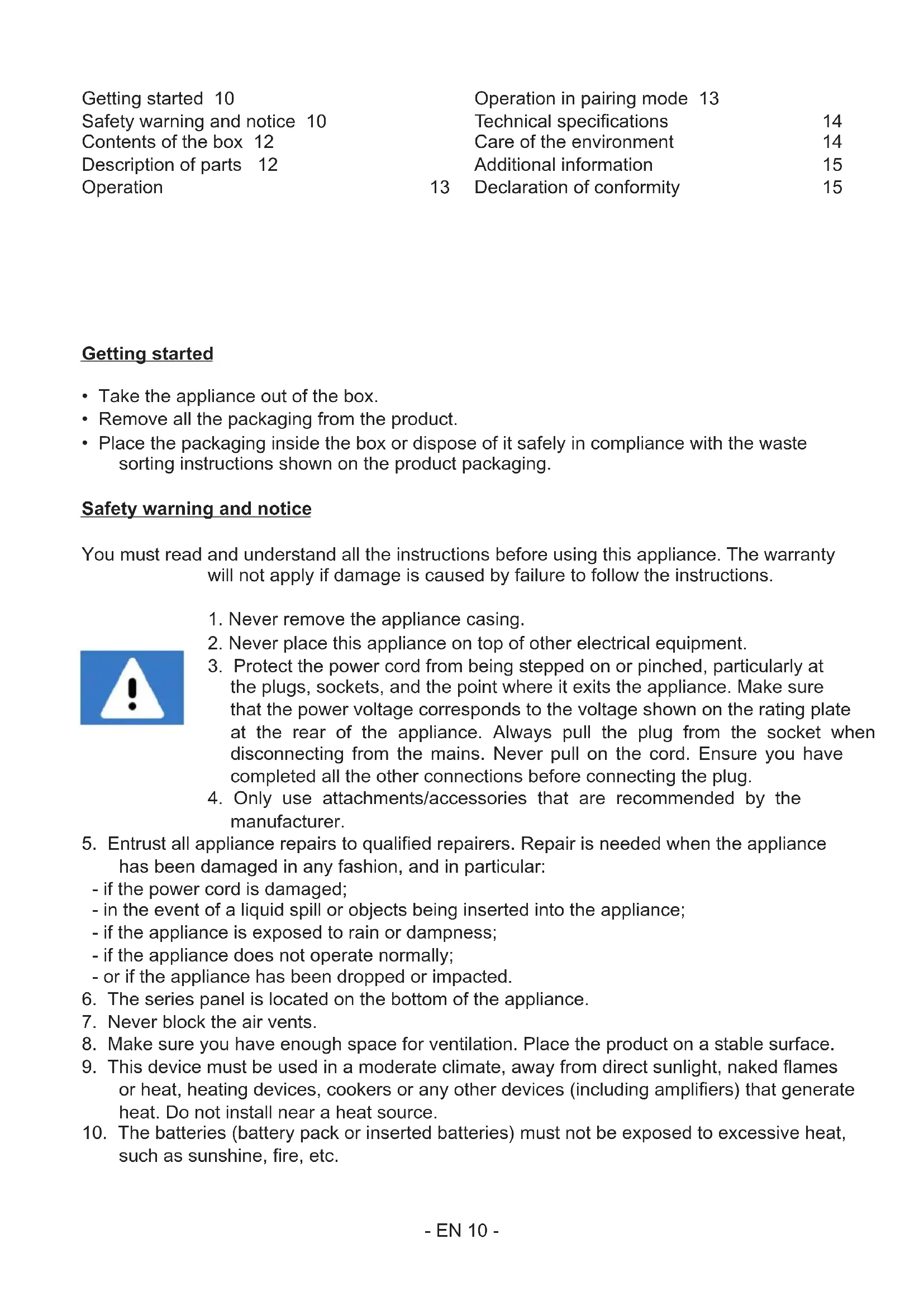 such as sunshine, re, etc. Getting started 10 Safety warning and notice 10 Contents of the box 12 Description of parts 12 Operation 13 Operation in pairing mode 13 Technical specications 14 Care of the environment 14 Additional information 15 Declaration of conformity 15- EN 11 -