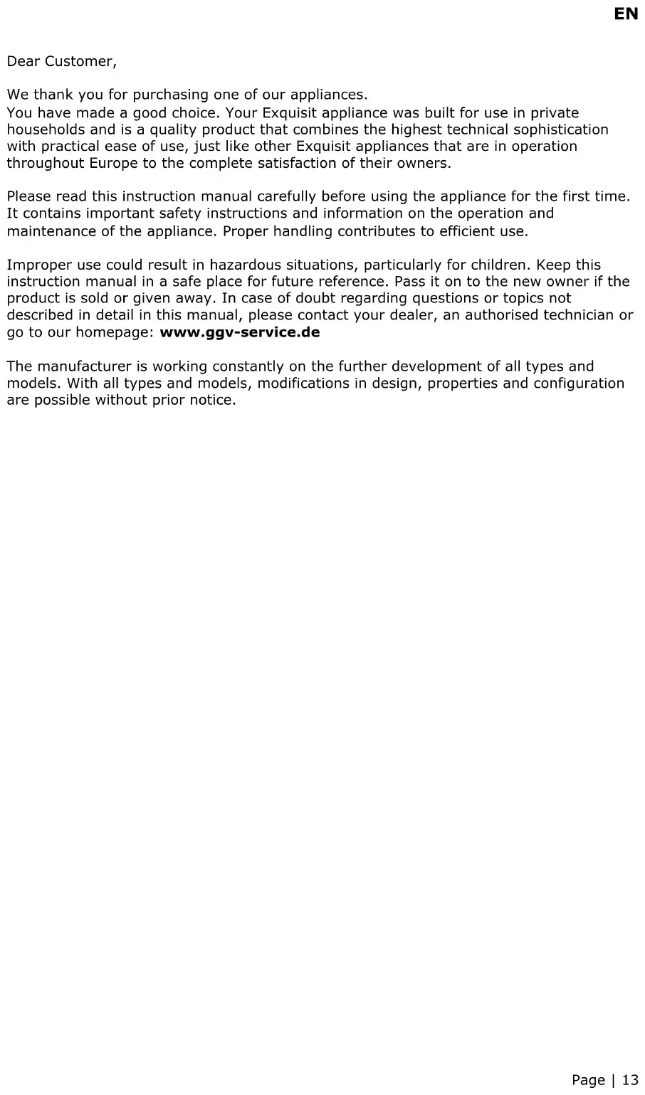 - Wird ein Gerät repariert, sind die Reparaturrechnungen sofort fällig und ohne Abzug zu bezahlen.EN Page | 13 Dear Customer, We thank you for purchasing one of our appliances. You have made a good choice. Your Exquisit appliance was built for use in private households and is a quality product that combines the highest technical sophistication with practical ease of use, just like other Exquisit appliances that are in operation throughout Europe to the complete satisfaction of their owners. Please read this instruction manual carefully before using the appliance for the first time. It contains important safety instructions and information on the operation and maintenance of the appliance. Proper handling contributes to efficient use. Improper use could result in hazardous situations, particularly for children. Keep this instruction manual in a safe place for future reference. Pass it on to the new owner if the product is sold or given away. In case of doubt regarding questions or topics not described in detail in this manual, please contact your dealer, an authorised technician or go to our homepage: www.ggv-service.de The manufacturer is working constantly on the further development of all types and models. With all types and models, modifications in design, properties and configuration are possible without prior notice.EN Page | 14 7 Safety