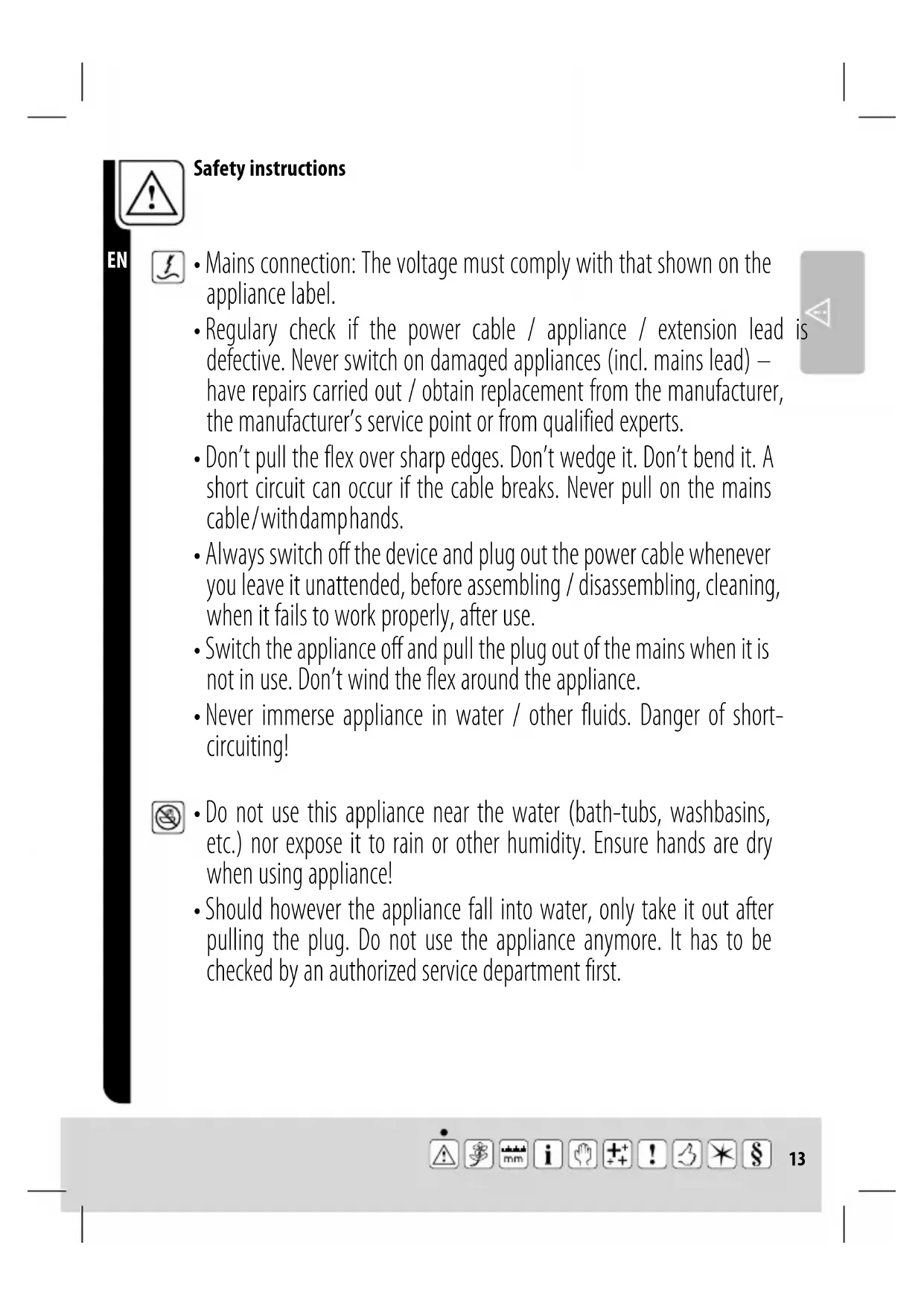 - Do not use this appliance near the water (bath-tubs, washbasins, etc.) nor expose it to rain or other humidity. Ensure hands are dry when using appliance!14 Safety instructions