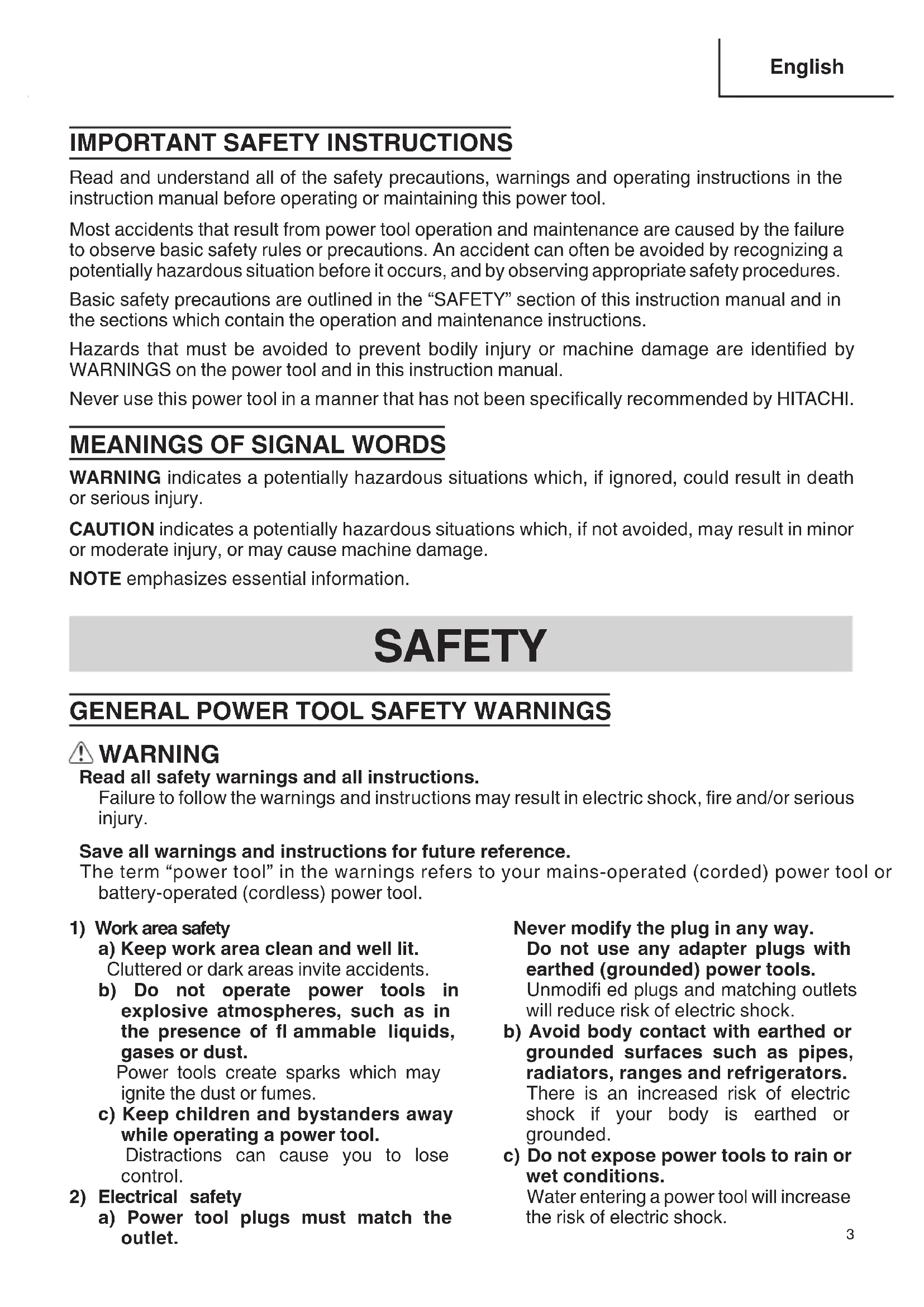 Read and understand all of the safety precautions, warnings and operating instructions in the instruction manual before operating or maintaining this power tool. Most accidents that result from power tool operation and maintenance are caused by the failure to observe basic safety rules or precautions. An accident can often be avoided by recognizing a potentially hazardous situation before it occurs, and by observing appropriate safety procedures. Basic safety precautions are outlined in the “SAFETY” section of this instruction manual and in the sections which contain the operation and maintenance instructions. Hazards that must be avoided to prevent bodily injury or machine damage are identifi ed by WARNINGS on the power tool and in this instruction manual. Never use this power tool in a manner that has not been specifi cally recommended by HITACHI.