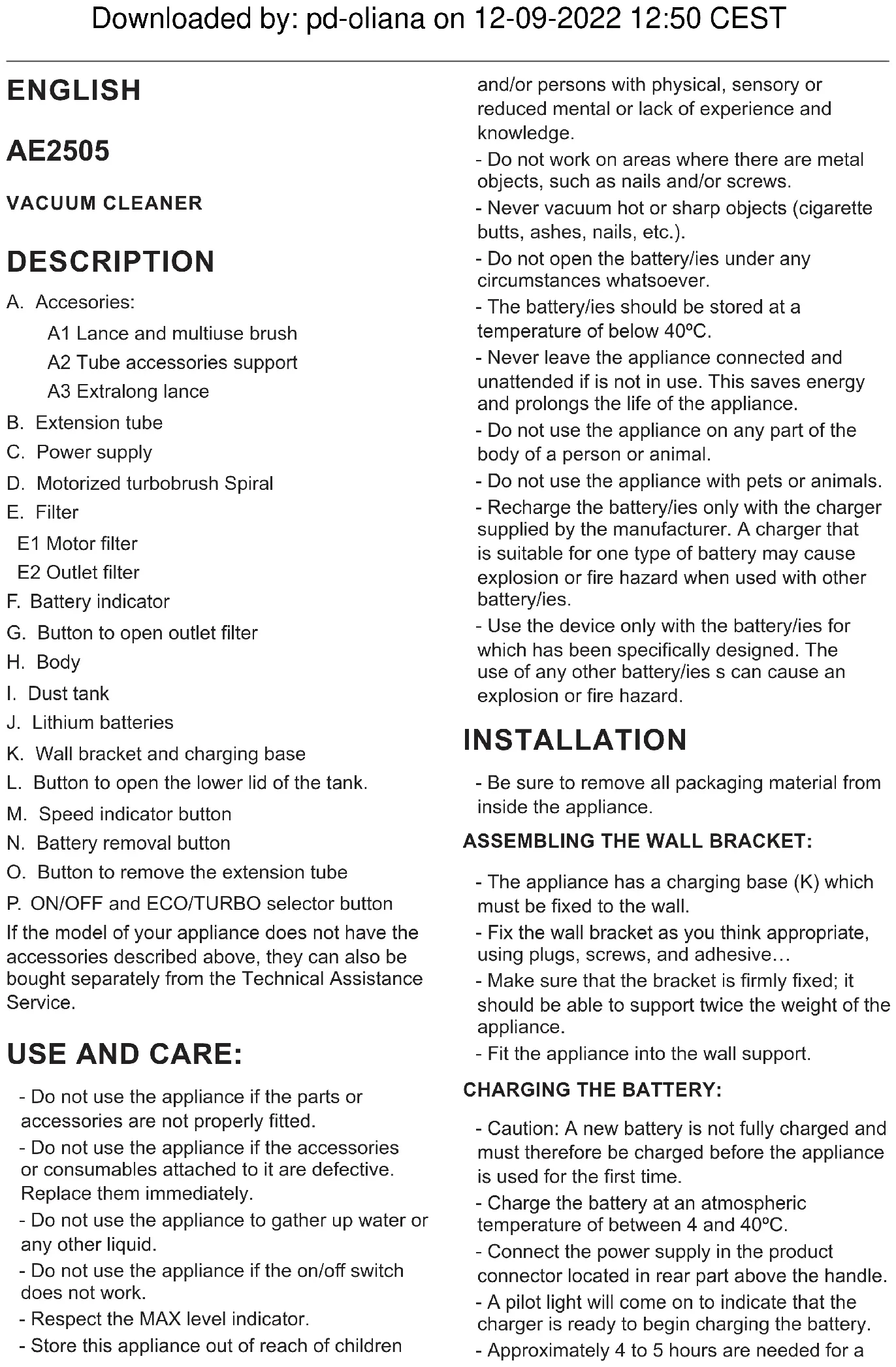 J. Lithium batteries K. Wall bracket and charging base L. Button to open the lower lid of the tank. M. Speed indicator button N. Battery removal button O. Button to remove the extension tube P. ON/OFF and ECO/TURBO selector button If the model of your appliance does not have the accessories described above, they can also be bought separately from the Technical Assistance Service. USE AND CARE: - Do not use the appliance if the parts or accessories are not properly tted. - Do not use the appliance if the accessories or consumables attached to it are defective. Replace them immediately. - Do not use the appliance to gather up water or any other liquid. - Do not use the appliance if the on/o switch does not work. - Respect the MAX level indicator. - Store this appliance out of reach of children and/or persons with physical, sensory or reduced mental or lack of experience and knowledge. - Do not work on areas where there are metal objects, such as nails and/or screws. - Never vacuum hot or sharp objects (cigarette butts, ashes, nails, etc.). - Do not open the battery/ies under any circumstances whatsoever. - The battery/ies should be stored at a temperature of below 40ºC. - Never leave the appliance connected and unattended if is not in use. This saves energy and prolongs the life of the appliance. - Do not use the appliance on any part of the body of a person or animal. - Do not use the appliance with pets or animals. - Recharge the battery/ies only with the charger supplied by the manufacturer. A charger that is suitable for one type of battery may cause explosion or re hazard when used with other battery/ies. - Use the device only with the battery/ies for which has been specically designed. The use of any other battery/ies s can cause an explosion or re hazard. INSTALLATION - Be sure to remove all packaging material from inside the appliance. ASSEMBLING THE WALL BRACKET: - The appliance has a charging base (K) which must be xed to the wall. - Fix the wall bracket as you think appropriate, using plugs, screws, and adhesive… - Make sure that the bracket is rmly xed; it should be able to support twice the weight of the appliance. - Fit the appliance into the wall support. CHARGING THE BATTERY: - Caution: A new battery is not fully charged and must therefore be charged before the appliance is used for the rst time. - Charge the battery at an atmospheric temperature of between 4 and 40ºC. - Connect the power supply in the product connector located in rear part above the handle. - A pilot light will come on to indicate that the charger is ready to begin charging the battery. - Approximately 4 to 5 hours are needed for a Downloaded by: pd-oliana on 12-09-2022 12:50 CESTcomplete charge of the battery. Never attempt to over-charge the battery (although it is recommended that the rst charge of the battery be of 6 hours in duration). - The pilot light will come on to indicate that the charger is charging the battery. - When the battery is charged disconnect the charger from the mains supply. - NB: Do not use the appliance while it is connected to the charger. HOW TO CHECK THE BATTERY’S CHARGE LEVEL: - Press the ON/OFF button (P), the pilot lights that indicate if it is charged will light up. - If all three pilot lights come on this means that the appliance is fully charged. - If no pilot light lights up, this means that the battery is completely at. - NB: For a long battery life, it is advisable to charge the battery, only, when it has run out completely.