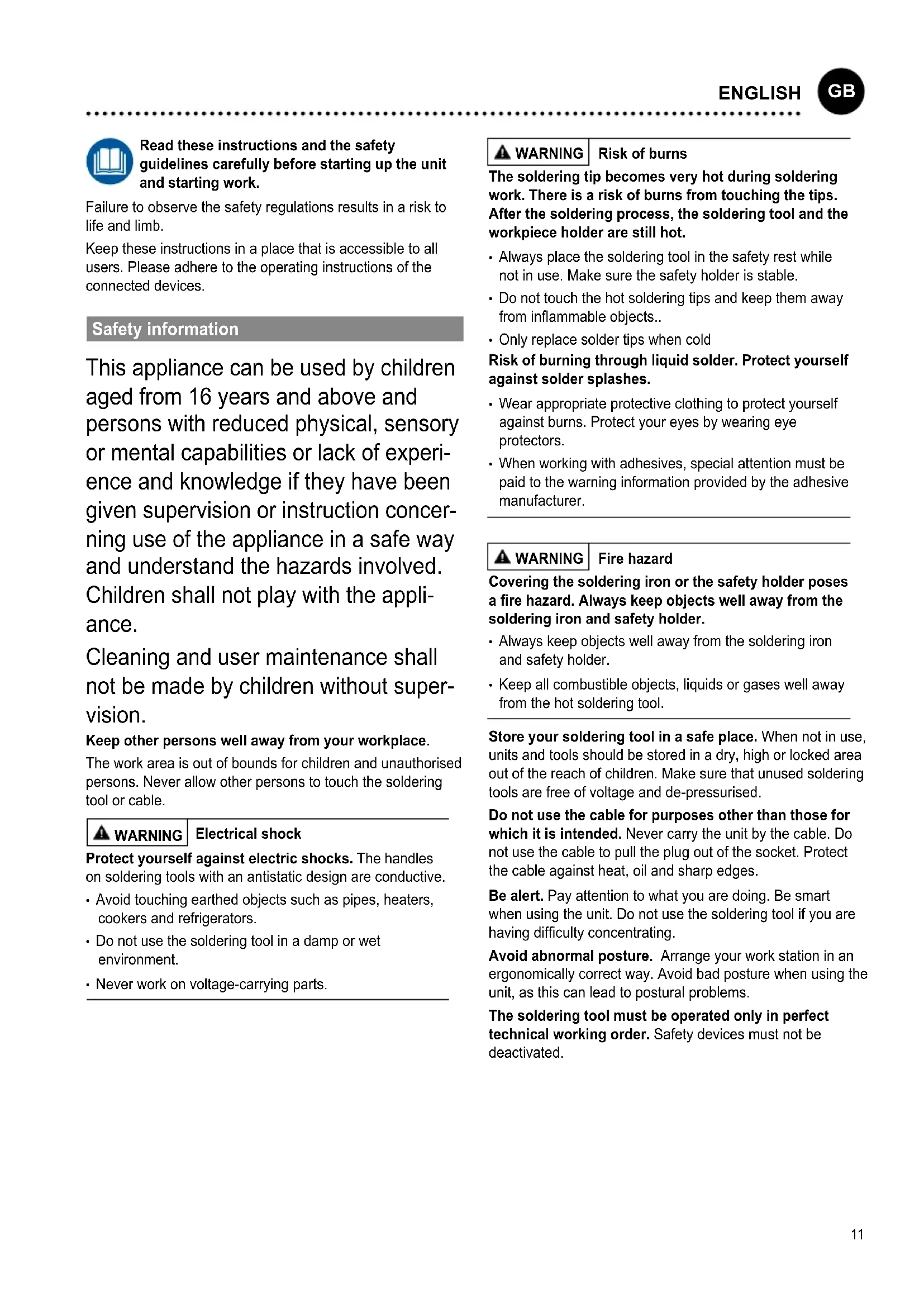 GB English Safety information | Soldering | Specied Conditions Of Use | User groups | Care and maintenance | Warranty | Technical Data | Temperature performance | Symbols
