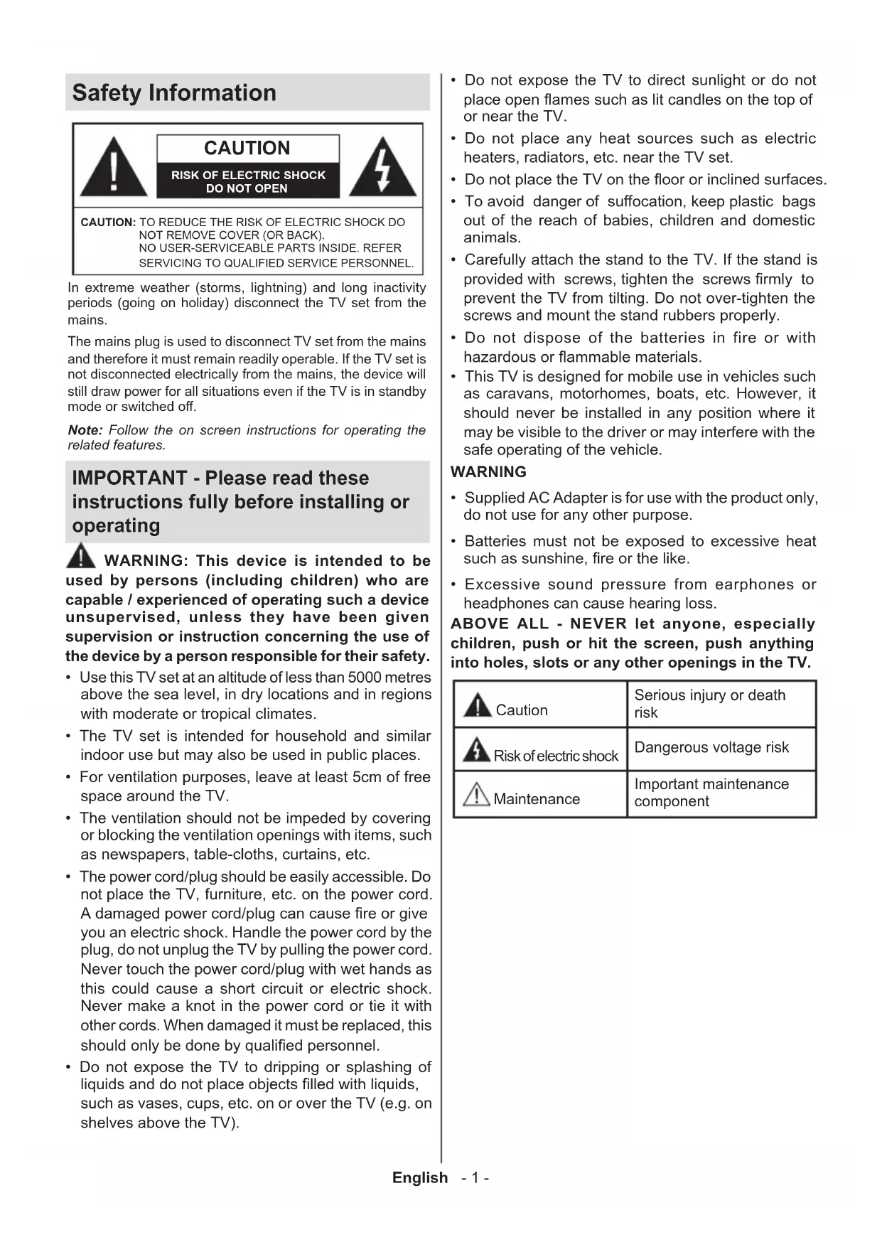 English - 1 - Safety Information CAUTION RISK OF ELECTRIC SHOCKDO NOT OPENCAUTION: TO REDUCE THE RISK OF ELECTRIC SHOCK DO NOT REMOVE COVER (OR BACK). NO USER-SERVICEABLE PARTS INSIDE. REFER SERVICING TO QUALIFIED SERVICE PERSONNEL.Note: Follow the on screen instructions for operating the related features.In extreme weather (storms, lightning) and long inactivity periods (going on holiday) disconnect the TV set from the mains.The mains plug is used to disconnect TV set from the mains and therefore it must remain readily operable. If the TV set is not disconnected electrically from the mains, the device will still draw power for all situations even if the TV is in standby mode or switched o. IMPORTANT - Please read these instructions fully before installing or operating