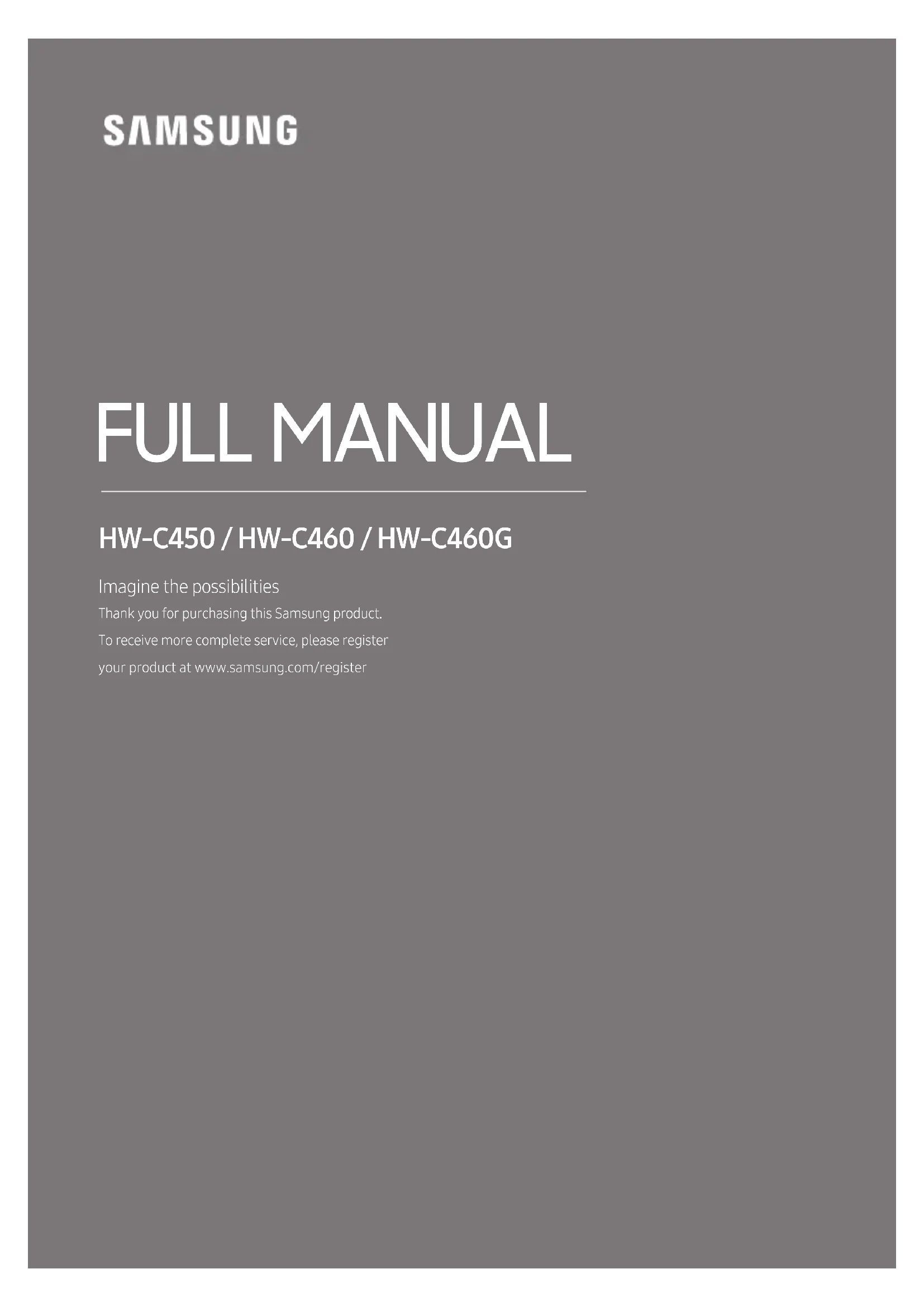 HW-C450 / HW-C460 / HW-C460G FULL MANUAL Imagine the possibilities Thank you for purchasing this Samsung product. To receive more complete service, please register your product at www.samsung.com/registerENG - 2 SAFETY INFORMATION SAFETY WARNINGS TO REDUCE THE RISK OF ELECTRIC SHOCK, DO NOT REMOVE THE COVER (OR BACK). NO USER-SERVICEABLE PARTS ARE INSIDE.