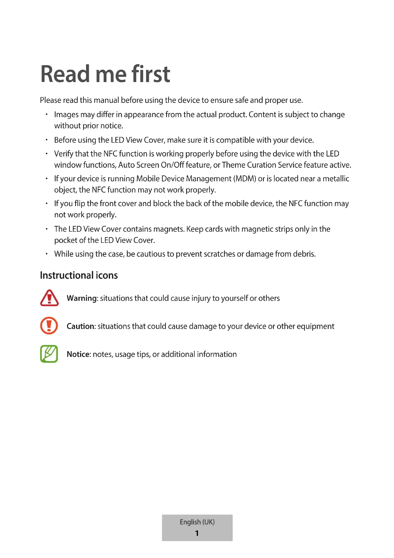 Caution: situations that could cause damage to your device or other equipment Notice: notes, usage tips, or additional information English (UK)