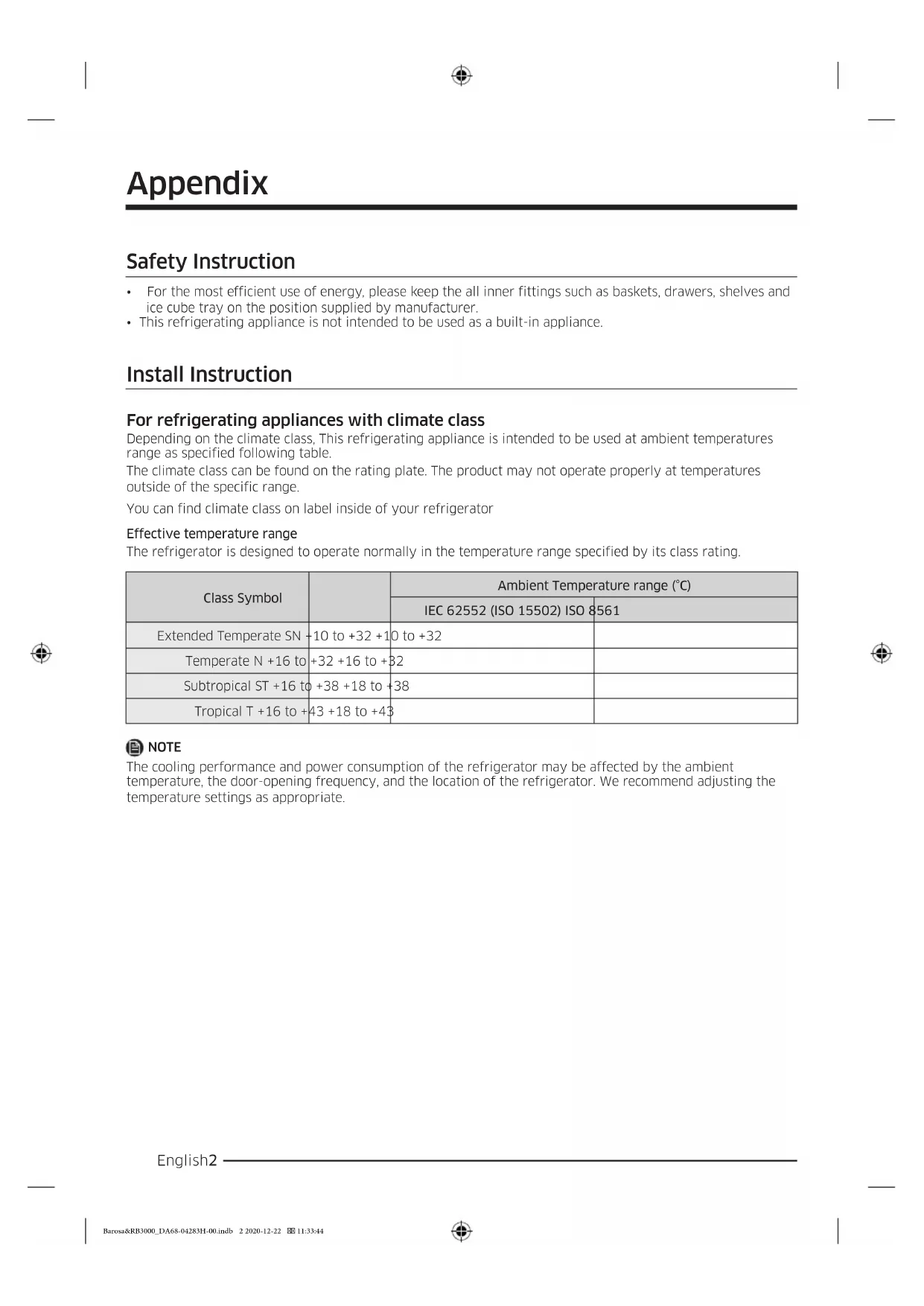 Extended Temperate SN +10 to +32 +10 to +32 Temperate N +16 to +32 +16 to +32 Subtropical ST +16 to +38 +18 to +38 Tropical T +16 to +43 +18 to +43 NOTE The cooling performance and power consumption of the refrigerator may be affected by the ambient temperature, the door-opening frequency, and the location of the refrigerator. We recommend adjusting the temperature settings as appropriate. Barosa&RB3000_DA68-04283H-00.indb 2 2020-12-22 11:33:44English 3 Temperature Instruction Recommended Temperature The optimal temperature setting for food storage: