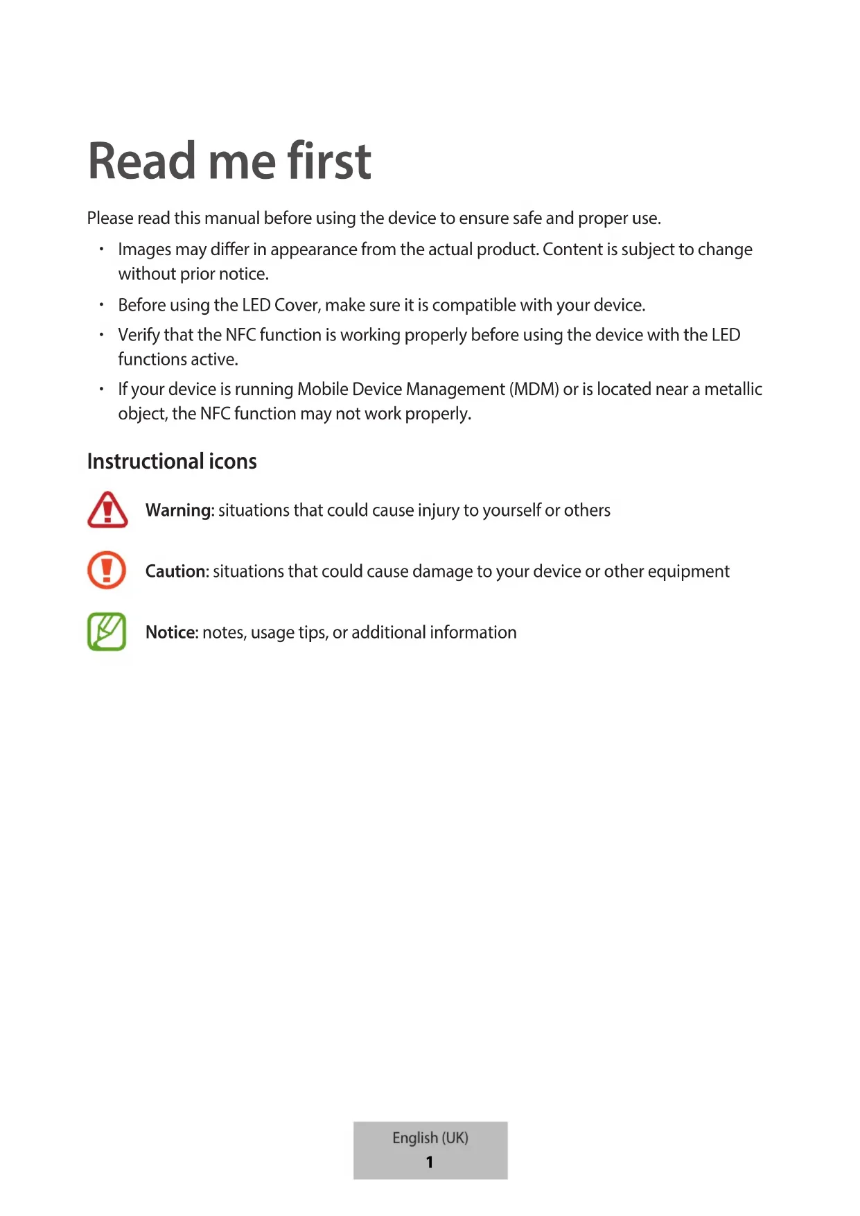 Caution: situations that could cause damage to your device or other equipment Notice: notes, usage tips, or additional information English (UK)