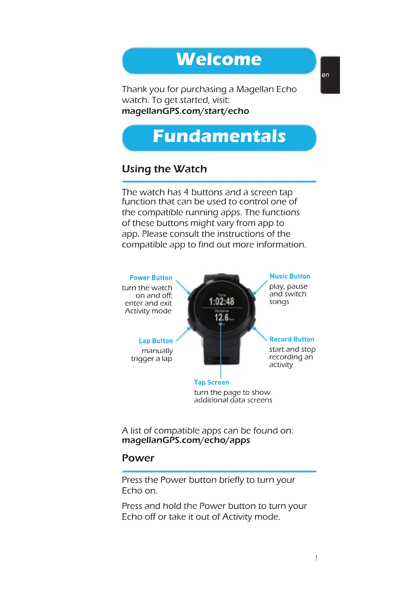 Welcome Thank you for purchasing a Magellan Echo watch. To get started, visit: magellanGPS.com/start/echo Fundamentals Using the Watch The watch has 4 buttons and a screen tap function that can be used to control one of the compatible running apps. The functions of these buttons might vary from app to app. Please consult the instructions of the compatible app to find out more information. Record Button start and stop recording an activity Music Button play, pause and switch songs Power Button turn the watch on and off; enter and exit Activity mode Lap Button manually trigger a lap Tap Screen turn the page to show additional data screens A list of compatible apps can be found on: magellanGPS.com/echo/apps Power Press the Power button briefly to turn your Echo on. Press and hold the Power button to turn your Echo off or take it out of Activity mode.2