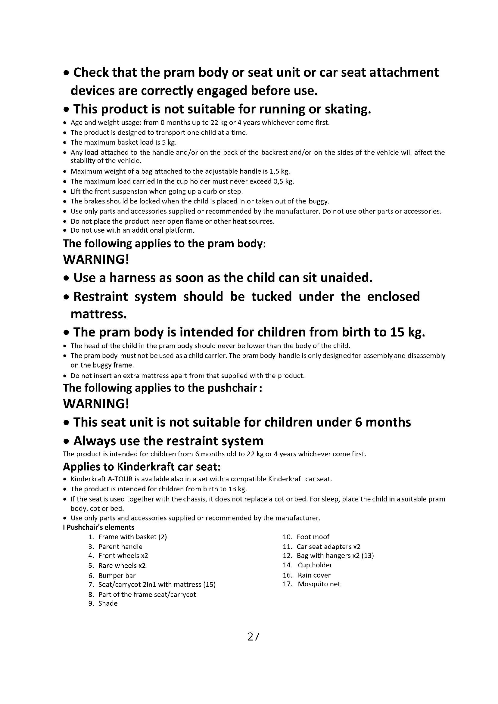 - Use only parts and accessories supplied or recommended by the manufacturer. I Pushchair's elements