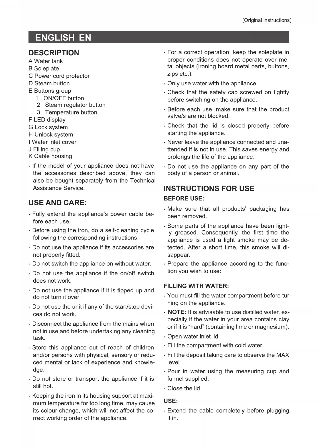 - Disconnect the appliance from the mains, empty the water tank (do it after each use) and let it cool before undertaking any cleaning task.ES (Instrucciones originales)