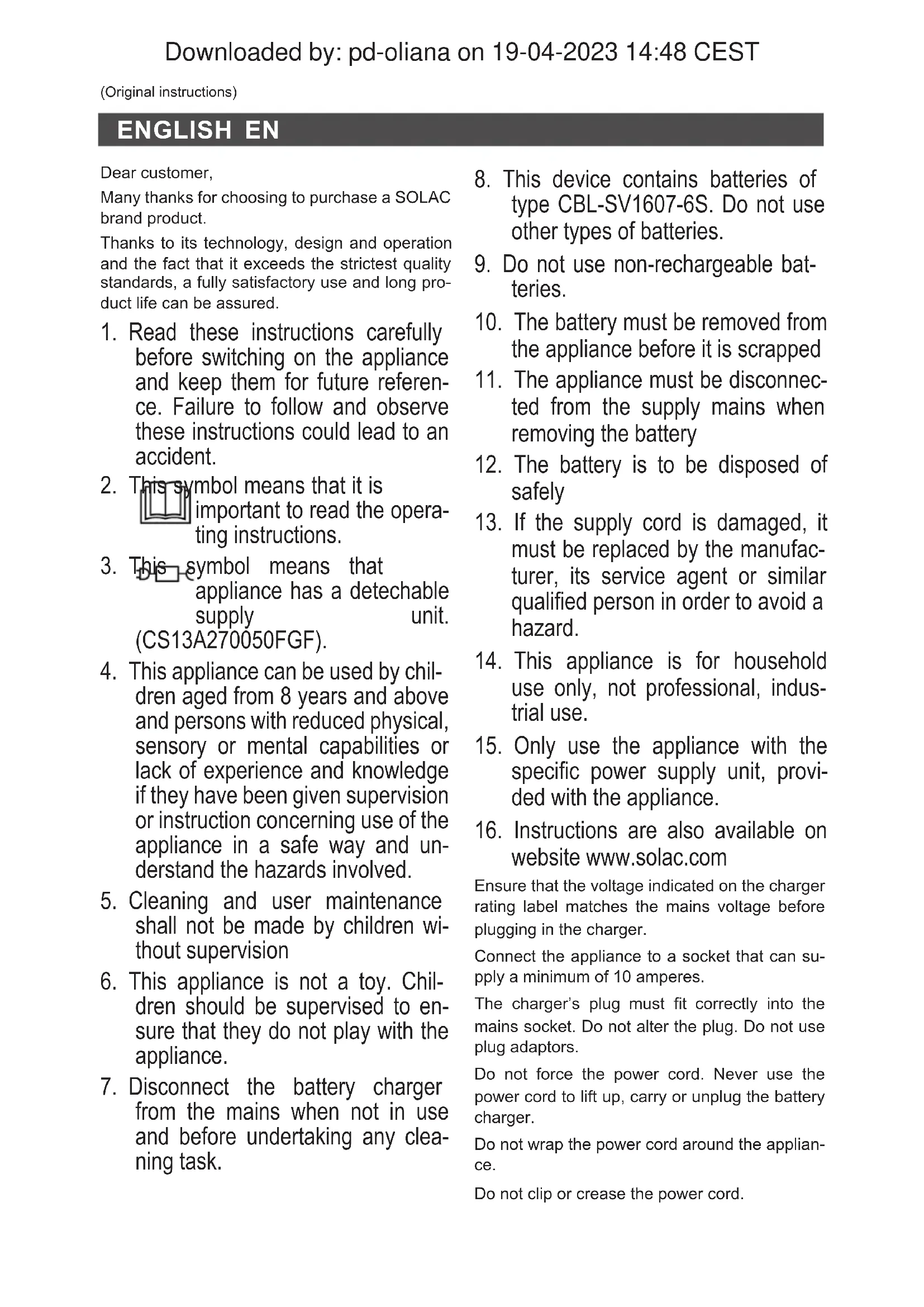 Downloaded by: pd-oliana on 19-04-2023 14:48 CESTENGLISH EN (Original instructions) Dear customer, Many thanks for choosing to purchase a SOLAC brand product. Thanks to its technology, design and operation and the fact that it exceeds the strictest quality standards, a fully satisfactory use and long pro- duct life can be assured.