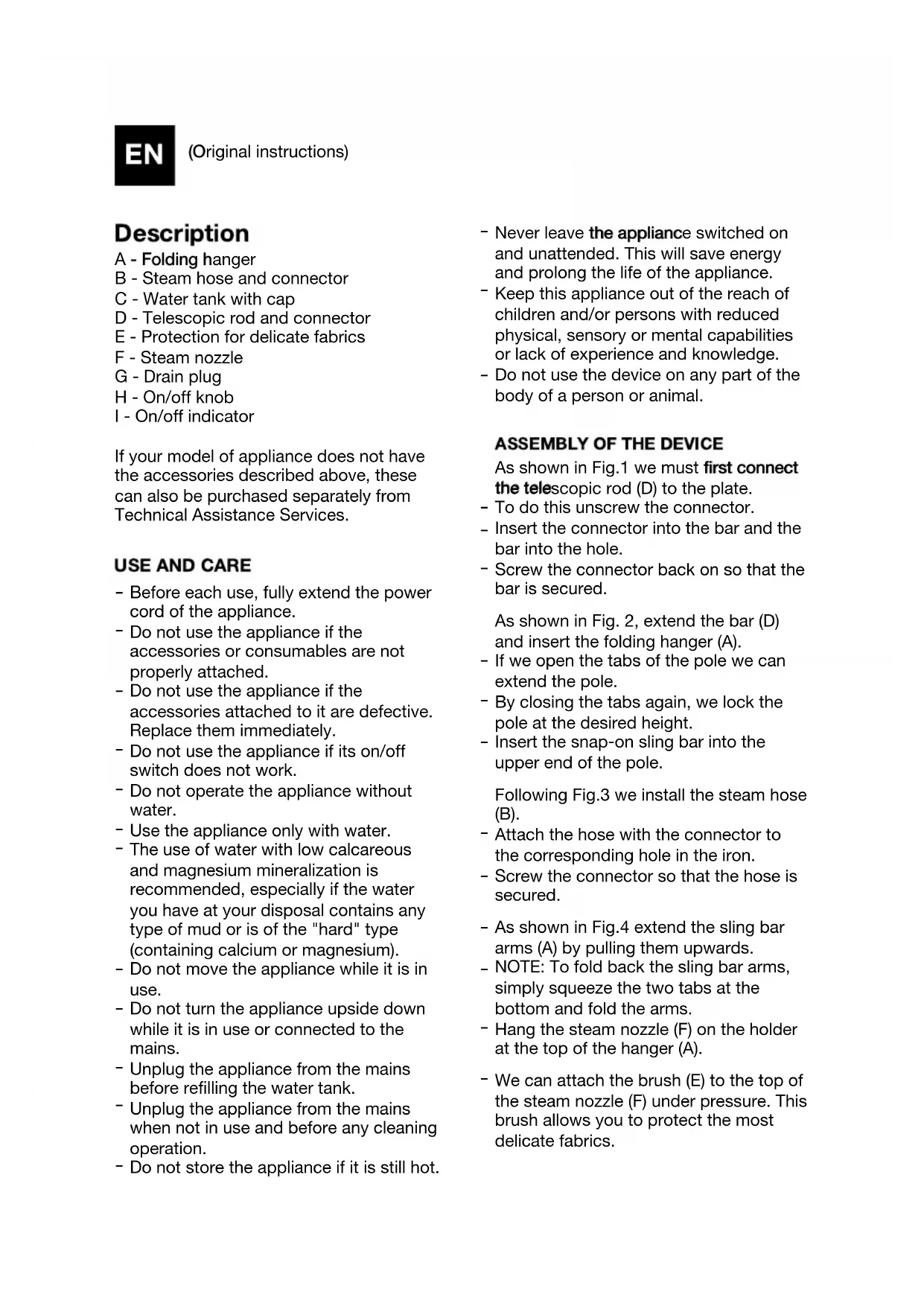 As shown in Fig.1 we must first connectthe telescopic rod (D) to the plate.To do this unscrew the connector.Insert the connector into the bar and thebar into the hole.Screw the connector back on so that thebar is secured.As shown in Fig. 2, extend the bar (D)and insert the folding hanger (A).If we open the tabs of the pole we canextend the pole.By closing the tabs again, we lock thepole at the desired height.Insert the snap-on sling bar into theupper end of the pole.Following Fig.3 we install the steam hose (B). Attach the hose with the connector tothe corresponding hole in the iron.Screw the connector so that the hose issecured.As shown in Fig.4 extend the sling bararms (A) by pulling them upwards.NOTE: To fold back the sling bar arms,simply squeeze the two tabs at thebottom and fold the arms.Hang the steam nozzle (F) on the holderat the top of the hanger (A).We can attach the brush (E) to the top ofthe steam nozzle (F) under pressure. Thisbrush allows you to protect the mostdelicate fabrics.