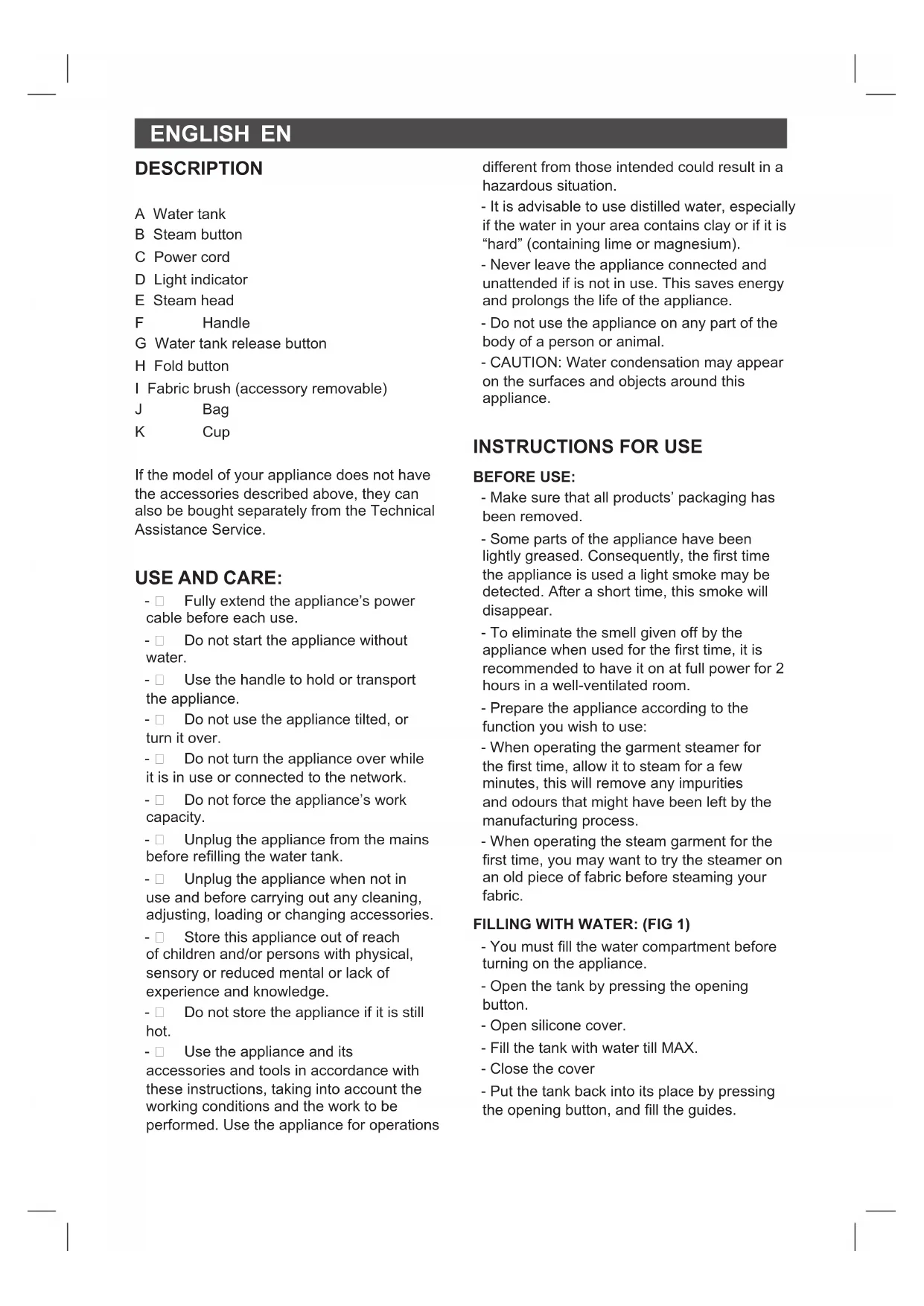 BEFORE USE: - Makesurethatallproducts’packaginghas been removed. - Some parts of the appliance have been lightlygreased.Consequently,thersttime the appliance is used a light smoke may be detected. After a short time, this smoke will disappear. - To eliminate the smell given off by the appliancewhenusedforthersttime,itis recommended to have it on at full power for 2 hours in a well-ventilated room. - Prepare the appliance according to the functionyouwishtouse: - When operating the garment steamer for thersttime,allowittosteamforafew minutes, this will remove any impurities and odours that might have been left by the manufacturing process. - When operating the steam garment for the rsttime,youmaywanttotrythesteameron an old piece of fabric before steaming your fabric. FILLING WITH WATER: (FIG 1) - Youmustllthewatercompartmentbefore turning on the appliance. - Openthetankbypressingtheopening button. - Opensiliconecover. - Fill the tank with water till MAX. - Close the cover - Put the tank back into its place by pressing theopeningbutton,andlltheguides.EN USE: - Extendthecablecompletelybeforeplugging it in. - Connect the appliance to the mains. - The pilot light comes on in red color. - Leave to heat up for a few Minutes. - Wait until the pilot light change to green will indicate that the appliance has reached an adequate temperature. - Duringtheappliance’susethepilotlightwill come on and off automatically, indicating the heating elements are working, and therefore maintaining the desired temperature. - Push the Steam button to start working - Orienttheappliancetodirectthesteamow in the desired direction STEAM GARMENT: - The steam garment is easy to use and is perfect for removing wrinkles/creases from garments and curtains as well as refreshing furnishings fabrics. - It can be used on most fabric as long as the fabric is hanging or where the garment steamer can be easily used in an upright position moving over the fabric in an up and down motion. - NOTE:thegarmentsteamerisdesignedto be used in an upright position on hanging garments, refrain from using the steamer in or on garments in a horizontal position. - Hang the garment from a hanger and stretch the fabric slightly with one hand. - Check that there is ventilation behind the fabric. - Check garment pockets are empty. - NOTE:werecommendyoudonotsteam over metal accessories, use caution and steam around the metal accessories.