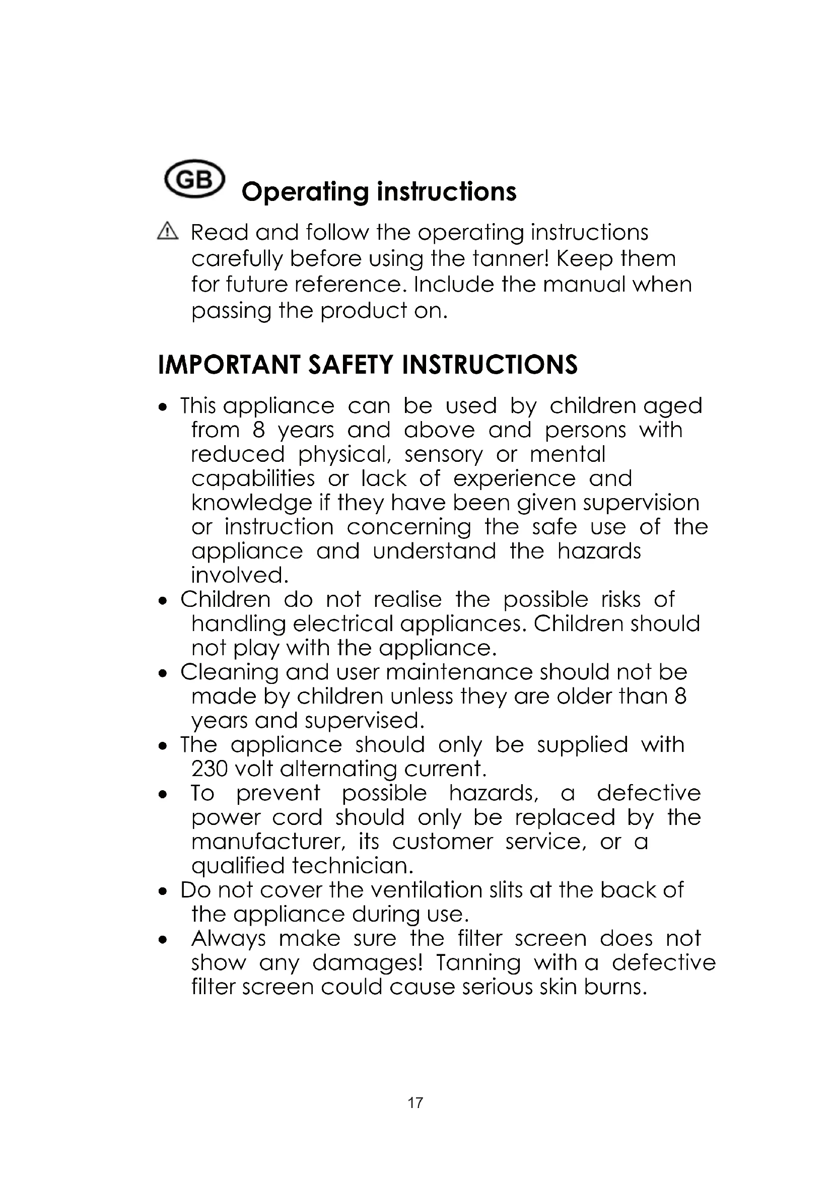 This appliance can be used by children aged from 8 years and above and persons with reduced physical, sensory or mental capabilities or lack of experience and knowledge if they have been given supervision or instruction concerning the safe use of the appliance and understand the hazards involved. Children do not realise the possible risks of handling electrical appliances. Children should not play with the appliance. Cleaning and user maintenance should not be made by children unless they are older than 8 years and supervised. The appliance should only be supplied with 230 volt alternating current. To prevent possible hazards, a defective power cord should only be replaced by the manufacturer, its customer service, or a qualified technician. Do not cover the ventilation slits at the back of the appliance during use. Always make sure the filter screen does not show any damages! Tanning with a defective filter screen could cause serious skin burns. 17OKB 912 D 20 For reasons of technical safety, do not use water on the appliance nor immerse in water. Do not use the appliance near water (e.g. in bath rooms, near showers or a pool). Do not use the appliance with a defective timer. Do not use the appliance in a potentially explosive area. Unplug the appliance after every use. Only store away after the appliance has cooled down. (Cool down period appr. 15 minutes) Caution: The lamp will not illuminate when it is hot. Let the lamp cool down 4 to 5 minutes before using it again. Certain materials that fade out in sunlight (e.g. paintings) should also not be exposed to the appliance’s UV radiation for a prolonged time. Non users, especially children, should not be present when the appliance is in use. UV appliances should not be used by: o persons younger than 18 years; o persons that tend to get freckles; o persons with natural red hair; o persons with atypically discoloured skin areas; o persons with more than 16 moles (diameter 2 mm or bigger) on their whole body; o persons with atypical moles (atypical moles are described as asymmetric moles with a diameter bigger than 5 mm, varying pigmentation, and irregular boundaries); o persons who suffer from sunburn; o persons that do not tan at all or not without getting sunburned when exposed to sunlight; 1821 OKB 912 - 290917 o persons easily getting a sunburn when exposed to sunlight; o persons having a history of repeated, serious sunburns during childhood; o persons suffering or having suffered from skin cancer or having a predisposition towards it; o persons whose first-degree relatives have been diagnosed with black skin cancer (melanoma); o persons under medical treatment for health problems resulting from sensitivity to light; o persons taking photosensitising medication. The exposure should not exceed the personal minimum erythermal dose (MED), i.e. the minimum UV dose causing perceptible reddening of the skin. If an erythema (skin redness) occurs hours after the treatment, no further exposures should take place. Treatment could be resumed after a week’ break, starting from the beginning of the tanning guidance. Consult a physician prior to further treatments if unexpected effects, such as itching, occur within 48h after the first exposure. Ultraviolet radiation of the sun or UV appliances can cause irreversible damages to skin or eyes. This biological effect depends on the quality and quantity of the radiation as well as the individual skin and eye sensibility. The skin can react with a sunburn to excessive exposure. Repeated excessive UV exposure of the sun or UV appliances can cause premature skin aging as well as an enhanced risk of skin cancer. These risks increase with every UV exposure. 19OKB 912 D 22 The surface of the unprotected eye can inflame, and excessive exposure can even damage the retina under certain circumstances. A cataract can build up after several repeated exposures. Consult a physician prior to treatment when suffering from individual sensibilities or allergic reactions connected to UVA exposure.