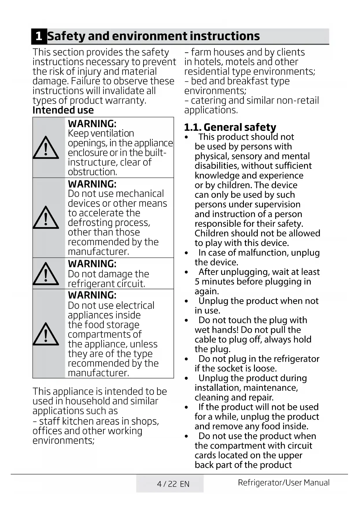 - Protecting the plastic surfaces 7 Troubleshooting 164 / 22 EN Refrigerator/User Manual 1 Safety and environment instructions This section provides the safety instructions necessary to prevent the risk of injury and material damage. Failure to observe these instructions will invalidate all types of product warranty. Intended use p. 15