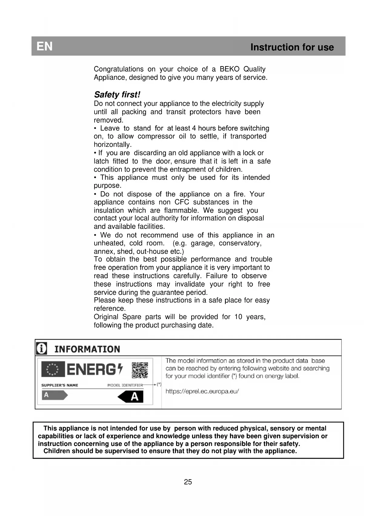 This appliance is not intended for use by person with reduced physical, sensory or mental capabilities or lack of experience and knowledge unless they have been given supervision or instruction concerning use of the appliance by a person responsible for their safety. Children should be supervised to ensure that they do not play with the appliance.EN Instruction for use Electrical requirements Before inserting the plug into the wall socket make sure that the voltage and the frequency shown in the rating plate inside the appliance corresponds to your electricity supply. We recommend that this appliance is connected to the mains supply via a suitably switched and fused socket in a readily accessible position. The plug has to be accessible after installation in order to allow disconnection of the appliance from the supply after installation. Warning! This appliance must be earthed. Repairs to the electrical equipment may only be made by qualified experts. If the power cable is damaged, the manufacturer or customer service must replace it in order to avoid danger. ATTENTION! This appliance operates with R 600a which is an environmental friendly but flammable gas. During the transportation and fixing of the product, care must be taken not to damage the cooling system. If the cooling system is damaged and there is a gas leakage from the system, keep the product away from open flame sources and ventilate the room for a while. WARNING - Do not use mechanical devices or other means to accelerate the defrosting process, others than those recommended by the manufacturer. WARNING - Do not damage the refrigerant circuit. WARNING - Do not use electrical appliances inside the food storage compartments of the appliance, unless they are of the type recommended by the manufacturer. WARNING - If the supply cord is damaged, it must be replaced by the manufacturer, its service agent or similarly qualified persons in order to avoid a hazard. Transportation instructions