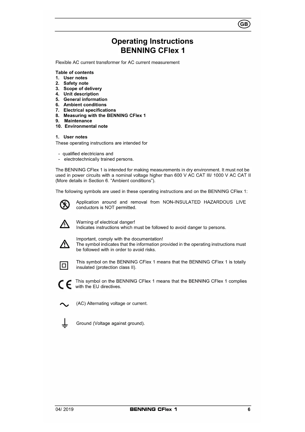 Operating Instructions BENNING CFlex 1 Flexible AC current transformer for AC current measurementTable of contents1. User notes2. Safety note3. Scope of delivery4. Unit description5. General information6. Ambient conditions7. Electrical specifications8. Measuring with the BENNING CFlex 19. Maintenance10. Environmental note1. User notesThese operating instructions are intended for - qualified electricians and - electrotechnically trained persons.The BENNING CFlex 1 is intended for making measurements in dry environment. It must not be used in power circuits with a nominal voltage higher than 600 V AC CAT III/ 1000 V AC CAT II (More details in Section 6. “Ambient conditions”).The following symbols are used in these operating instructions and on the BENNING CFlex 1:Application around and removal from NON-INSULATED HAZARDOUS LIVE conductors is NOT permitted. Warning of electrical danger!Indicates instructions which must be followed to avoid danger to persons. Important, comply with the documentation!The symbol indicates that the information provided in the operating instructions must be followed with in order to avoid risks. This symbol on the BENNING CFlex 1 means that the BENNING CFlex 1 is totally insulated (protection class II).This symbol on the BENNING CFlex 1 means that the BENNING CFlex 1 complies with the EU directives. (AC) Alternating voltage or current.Ground (Voltage against ground).04/ 2019 BENNING CFlex 1
