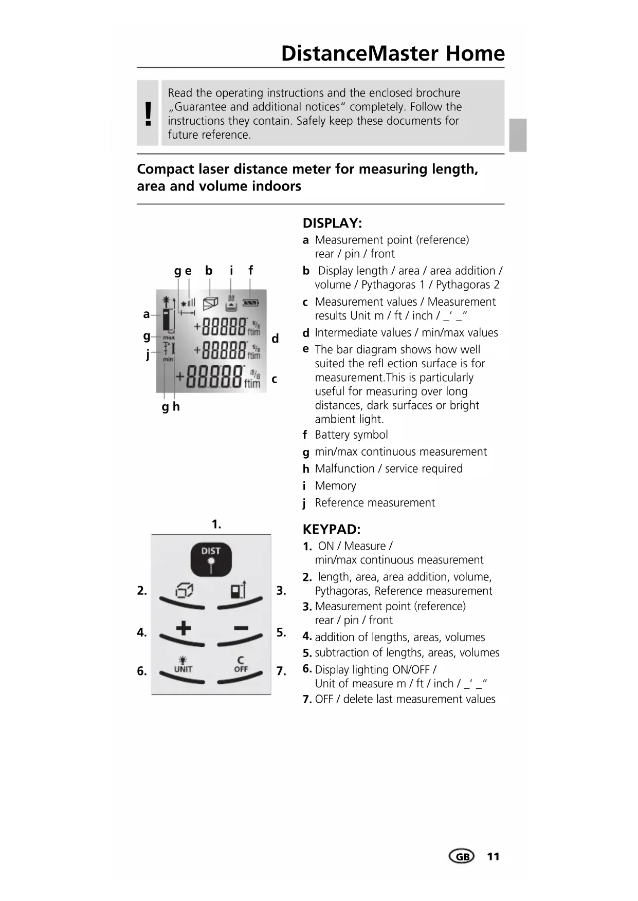 ON / Measure / min/max continuous measurement length, area, area addition, volume, Pythagoras, Reference measurementMeasurement point (reference) rear / pin / frontaddition of lengths, areas, volumessubtraction of lengths, areas, volumesDisplay lighting ON/OFF / Unit of measure m / ft / inch / _‘ _“OFF / delete last measurement valuesRead the operating instructions and the enclosed brochure „Guarantee and additional notices“ completely. Follow the instructions they contain. Safely keep these documents for future reference.