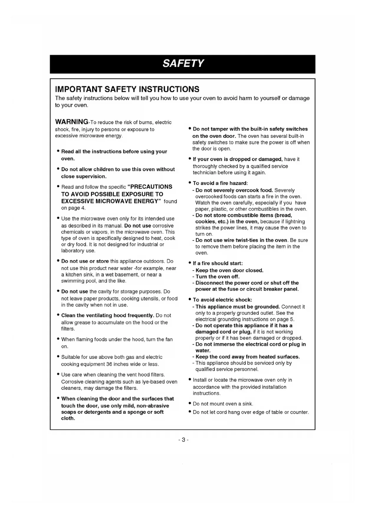 EXCESSIVE MICROWAVE ENERGY" foundon page 4.?Usethemicrowaveoven only foritsintendeduseasdescribedinitsmanual.Donotusecorrosivechemicalsor vapors, inthemicrowaveoven.This type ofovenis specifically designed heat, cookor dry food.Itisnot designed forindustrialor laboratory use.?Donotuseorstorethis appliance outdoors.Donotusethis product nearwater-for example, nearakitchen sink, inawet basement, ornear a swimming pool, andthelike.?Donotusethe cavity for storage purposes. Donotleave paper products, cooking utensils, orfoodinthe cavity whennotinuse.?Cleanthe ventilating hood frequently. Donotallow grease toaccumulateonthehoodorthefilters.?When flaming foodsunderthe hood, turnthefanon.?Suitableforuseaboveboth gas andelectric cooking equipment 36incheswideorless.?Usecarewhen cleaning theventhoodfilters.Corrosive cleaning agents suchas lye-based oven cleaners, may damage thefilters.?When cleaning thedoorandthesurfacesthattouchthe door, use only mild, non-abrasive soaps detergents anda sponge orsoftcloth.?Donot tamper withthebuilt-in safety switchesontheovendoor.Theovenhasseveralbuilt-in safety switchestomakesurethe power isoffwhenthedooris open. ?If your ovenis dropped damaged, haveit thoroughly checked