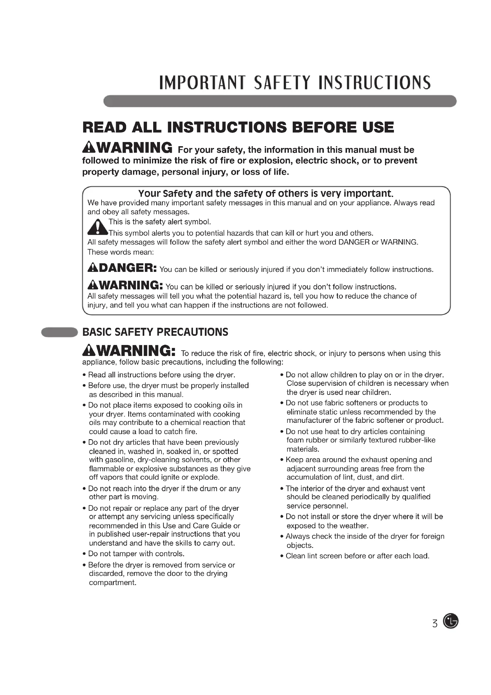 wWARNING: To reduce the risk of fire, electric shock, or injury to persons when using this appliance, follow basic precautions, including the following:• Read all instructions before using the dryer.• Before use, the dryer must be properly installed as described in this manual.• Do not place items exposed to cooking oils in your dryer. Items contaminated with cooking oils may contribute to a chemical reaction that could cause a load to catch fire. • Do not dry articles that have been previously cleaned in, washed in, soaked in, or spotted with gasoline, dry-cleaning solvents, or other flammable or explosive substances as they give off vapors that could ignite or explode.• Do not reach into the dryer if the drum or any other part is moving.• Do not repair or replace any part of the dryer or attempt any servicing unless specifically recommended in this Use and Care Guide or in published user-repair instructions that you understand and have the skills to carry out.• Do not tamper with controls.• Before the dryer is removed from service or discarded, remove the door to the drying compartment.• Do not allow children to play on or in the dryer. Close supervision of children is necessary when the dryer is used near children.• Do not use fabric softeners or products to eliminate static unless recommended by the manufacturer of the fabric softener or product.• Do not use heat to dry articles containing foam rubber or similarly textured rubber-like materials.• Keep area around the exhaust opening and adjacent surrounding areas free from the accumulation of lint, dust, and dirt.• The interior of the dryer and exhaust vent should be cleaned periodically by qualified service personnel.• Do not install or store the dryer where it will be exposed to the weather.• Always check the inside of the dryer for foreign objects.• Clean lint screen before or after each load.