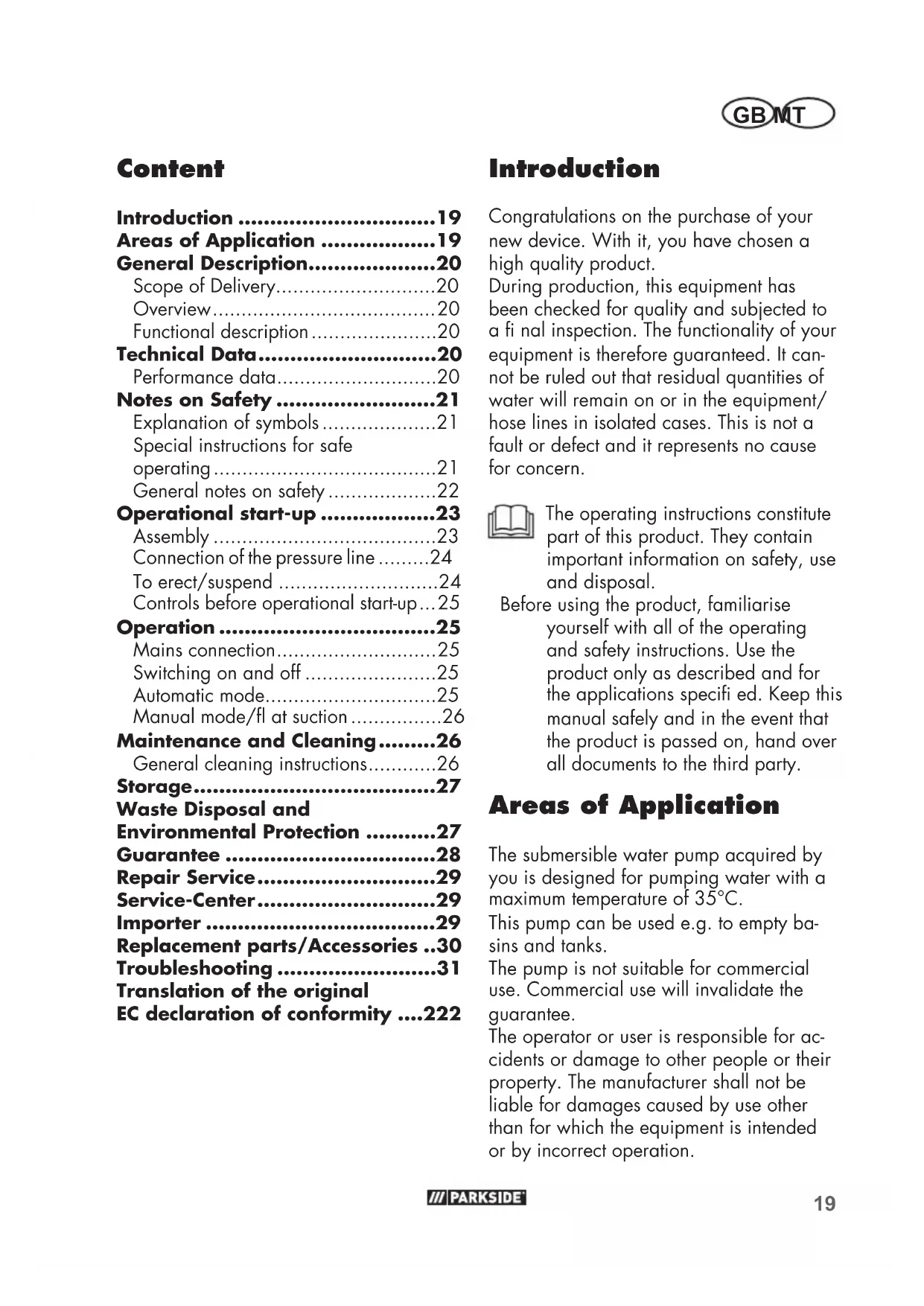 General Description The illustration of the principal functioning parts can be found on the front foldout page. Scope of Delivery Carefully unpack the appliance and check that it is complete. Dispose of the packag- ing material correctly. - Submersible water pump (pump) - Quick-connect adapter - Angle adapter - Hose adapter - 8m nylon rope - Instructional manual You need a hose clamp and a saw when connecting the hose (see under “Connec- ting the pressure line”). The tool is not included. The tool can be purchased from specialist dealers. Overview 1 Carrying handle 2 Mains cable 3 Pump casing 4 Pump output 5 Float switch 6 Float switch height adjustment 7 Float switch cable 8 Float switch guide 9 Hose adaptor 10 Angle adaptor 11 Quick-connect adapter 12 8 m nylon rope21 GB MT The measurement of the maximum perfor- mance data takes place under optimal con- ditions, such as a straight, direct exit. Notes on Safety