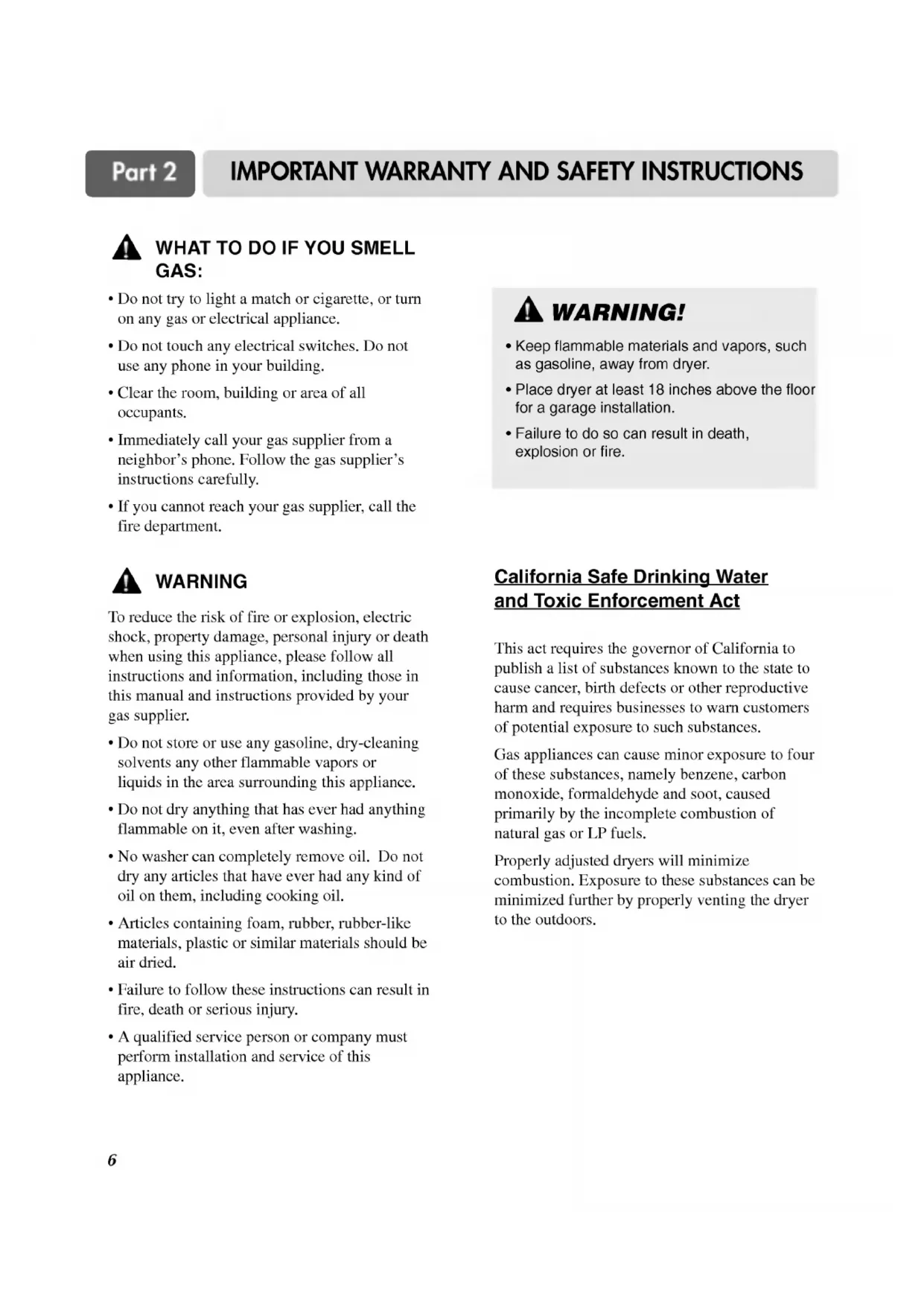 yourgas supplier. ?Donotstoreoruseany gasoline, dry-cleaning solvents anyotherflammablevaporsor liquids inthearea surrounding this appliance. ?Donot dry anything thathas ever had anything flammableon it, even after washing. ?No washer can completely remove oil. Donot dry anyarticlesthat have ever hadanykindofoilon them, including cooking oil. ?Articles containing foam, rubber, rubber-like materials, plastic orsimilarmaterialsshouldbeair dried. ?Failureto follow theseinstructionscanresult in fire, deathorserious injury. qualified service personorcompanymust perform installationand service ofthis appliance. California Safe Drinking WaterandToxic Enforcement ActThisact requires thegovernorof California publish alistofsubstances known tothestatetocause cancer, birthdefectsorother reproductive harmand requires businessesto warn customersof potential exposuretosuch substances. Gas appliances cancauseminorexposuretofourofthese substances, namely benzene, carbon monoxide, formaldehyde andsoot,caused primarily