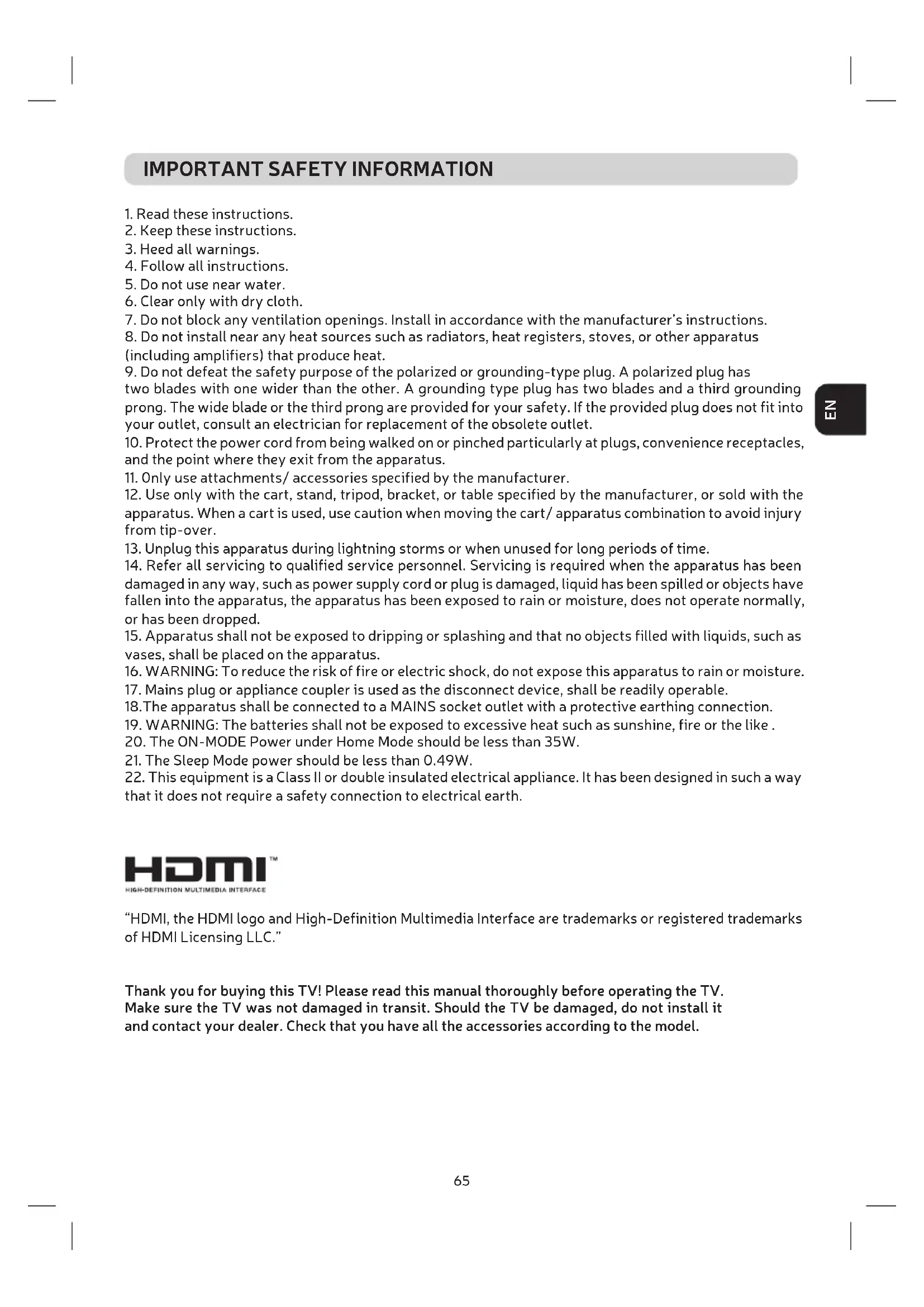 that it does not require a safety connecion to electrical earth. “HDMI, the HDMI logo and High-Deiniion Mulimedia Interface are trademarks or registered trademarks of HDMI Licensing LLC.” Thank you for buying this TV! Please read this manual thoroughly before operaing the TV. Make sure the TV was not damaged in transit. Should the TV be damaged, do not install it and contact your dealer. Check that you have all the accessories according to the model.