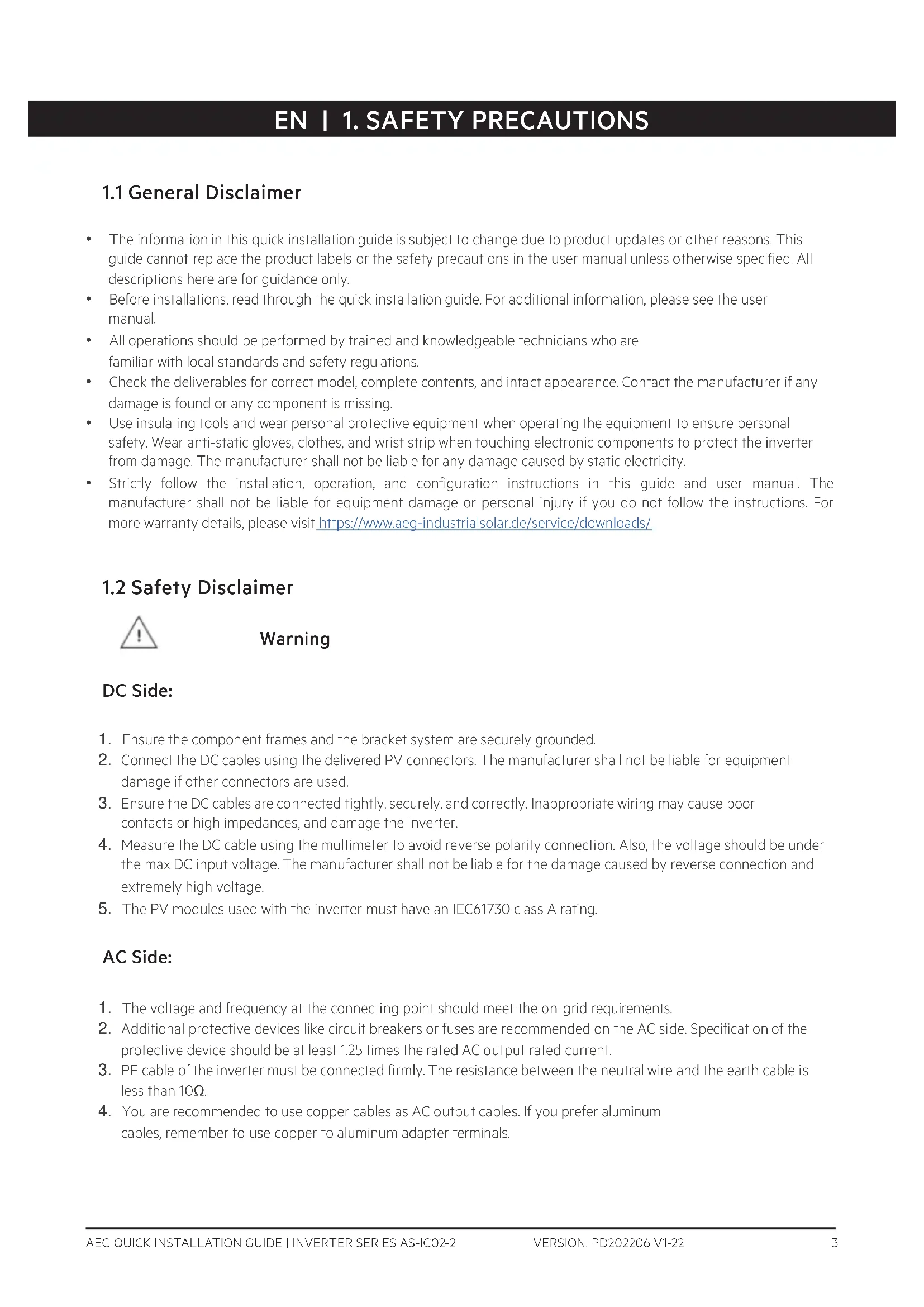 VERSION: PD202206 V1-22AEG QUICK INSTALLATION GUIDE | INVERTER SERIES AS-IC02-2 VERSION: PD202206 V1-22 2 Thank you for choosing the reliability of AEG grid-tied solar inverters. This guide is intended for distributors and installers involved in the planning, installation and commissioning of photovoltaic systems. AEG grid-tied solar inverters are tested and approved by acknowledged independent certification authorities and can only be installed by qualified professional companies. Please observe the standards and regulations applying to photovoltaic systems in the relevant countries, as well as the rules of the employers’ liability insurance associations for accident protection. Failure to comply with these can result in major injuries and damage. Keep this guide in a safe place for further reference as it contains important information for product care, maintenance and disposal.