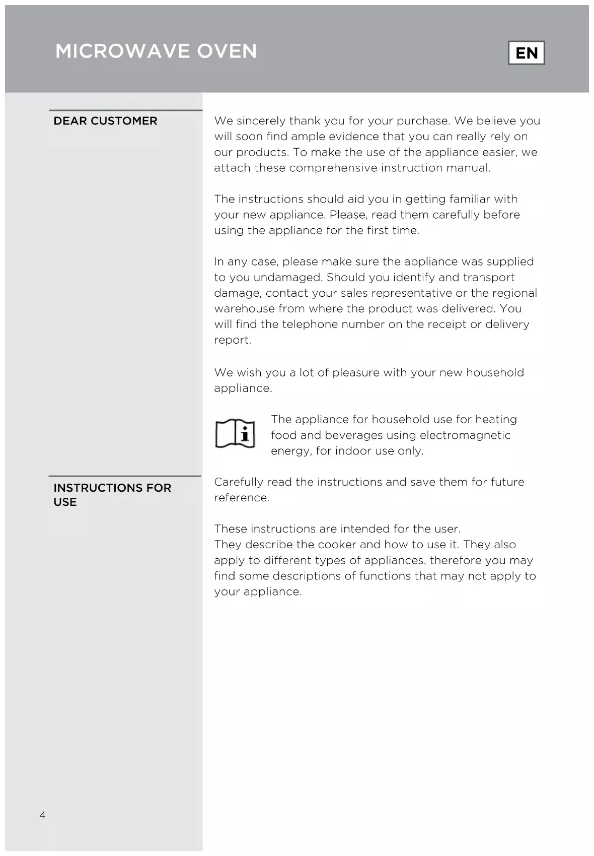 MICROWAVE OVEN5 Never touch the surfaces of heating or cooking appliances. They will become hot during operation. Keep children at a safe distance. There is a risk of burning! Microwave energy & High voltage! Do not remove the cover. WARNING! The appliance and its accessible parts become hot during use. Care should be taken to avoid touching heating elements. Children less than 8 years of age shall be kept away unless continuously supervised. Children should be supervised to ensure that they do not play with the appliance. This appliance can be used by children aged from 8 years and above and persons with reduced physical, sensory or mental capabilities or lack of experience and knowledge if they have been given supervision or instruction concerning use of the appliance in a safe way and understand the hazards involved. Children shall not play with the appliance. Cleaning and maintenance shall not be made by children unless they are older than 8 and supervised. Keep the appliance and its cord out of reach of children less than 8 years.