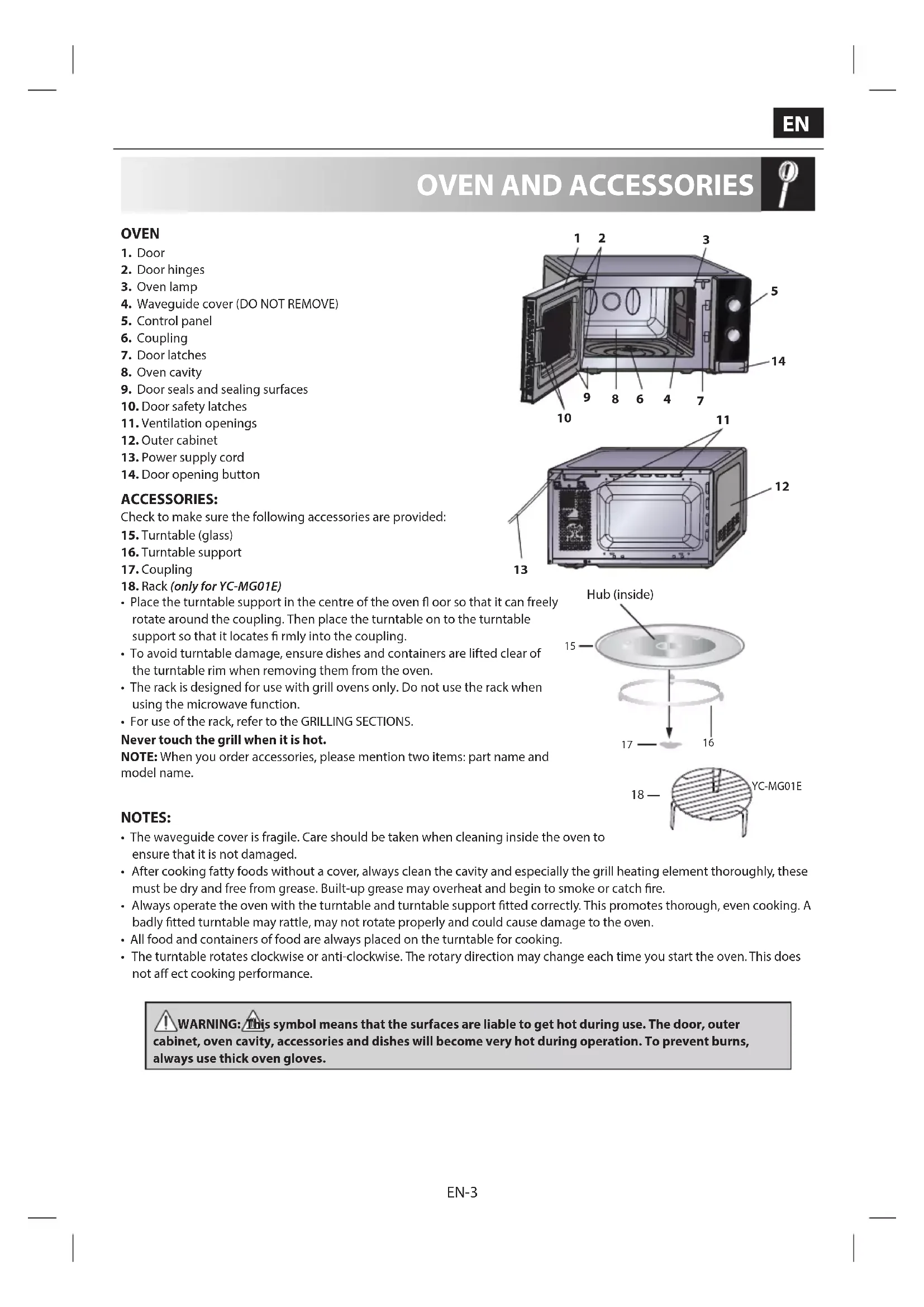 OVEN 1. Door2. Door hinges3. Oven lamp4. Waveguide cover (DO NOT REMOVE)5. Control panel6. Coupling7. Door latches8. Oven cavity9. Door seals and sealing surfaces10. Door safety latches11. Ventilation openings12. Outer cabinet13. Power supply cord14. Door opening button ACCESSORIES: Check to make sure the following accessories are provided:15. Turntable (glass)16. Turntable support17. Coupling18. Rack (only for YC-MG01E)• Place the turntable support in the centre of the oven oor so that it can freely rotate around the coupling. Then place the turntable on to the turntable support so that it locates rmly into the coupling.• To avoid turntable damage, ensure dishes and containers are lifted clear of the turntable rim when removing them from the oven.• The rack is designed for use with grill ovens only. Do not use the rack when using the microwave function.• For use of the rack, refer to the GRILLING SECTIONS.Never touch the grill when it is hot.NOTE: When you order accessories, please mention two items: part name and model name. NOTES: