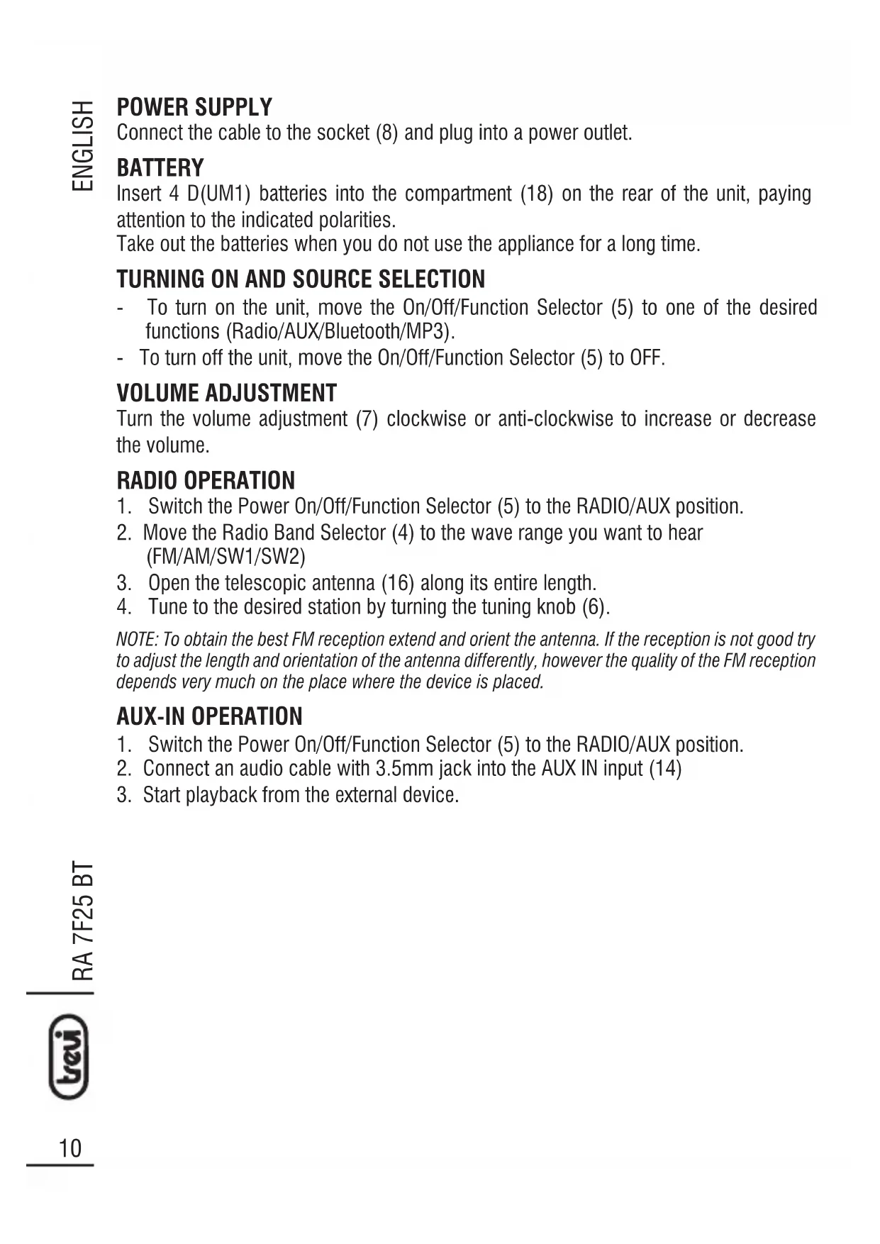 Use a slightly damp soft cloth for cleaning. Do not use solvents and abrasive substances. IMPORTANT This device is designed for home use (not professional use). This appliance has been carefully built to ensure long-lasting perfect performance. However, should any inconve- nience occur, please contact your local authorised TREVI Service Centre. TREVI follows a policy of ongoing research and development. Therefore products may have different features from those described.RA 7F25 BT
