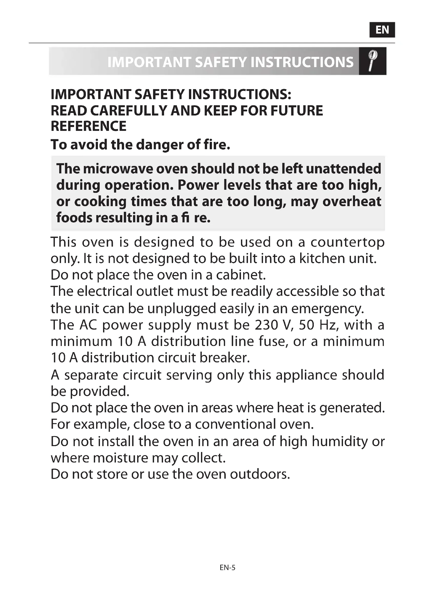 To avoid the danger of fire. The microwave oven should not be left unattended during operation. Power levels that are too high, or cooking times that are too long, may overheat foods resulting in a re. This oven is designed to be used on a countertop only. It is not designed to be built into a kitchen unit. Do not place the oven in a cabinet. The electrical outlet must be readily accessible so that the unit can be unplugged easily in an emergency. The AC power supply must be 230 V, 50 Hz, with a minimum 10 A distribution line fuse, or a minimum 10 A distribu tion circuit breaker. A separate circuit serving only this appliance should be provided. Do not place the oven in areas where heat is generated. For example, close to a conventional oven. Do not install the oven in an area of high humidity or where moisture may collect. Do not store or use the oven outdoors. IMPORTANT SAFETY INSTRUCTIONS: