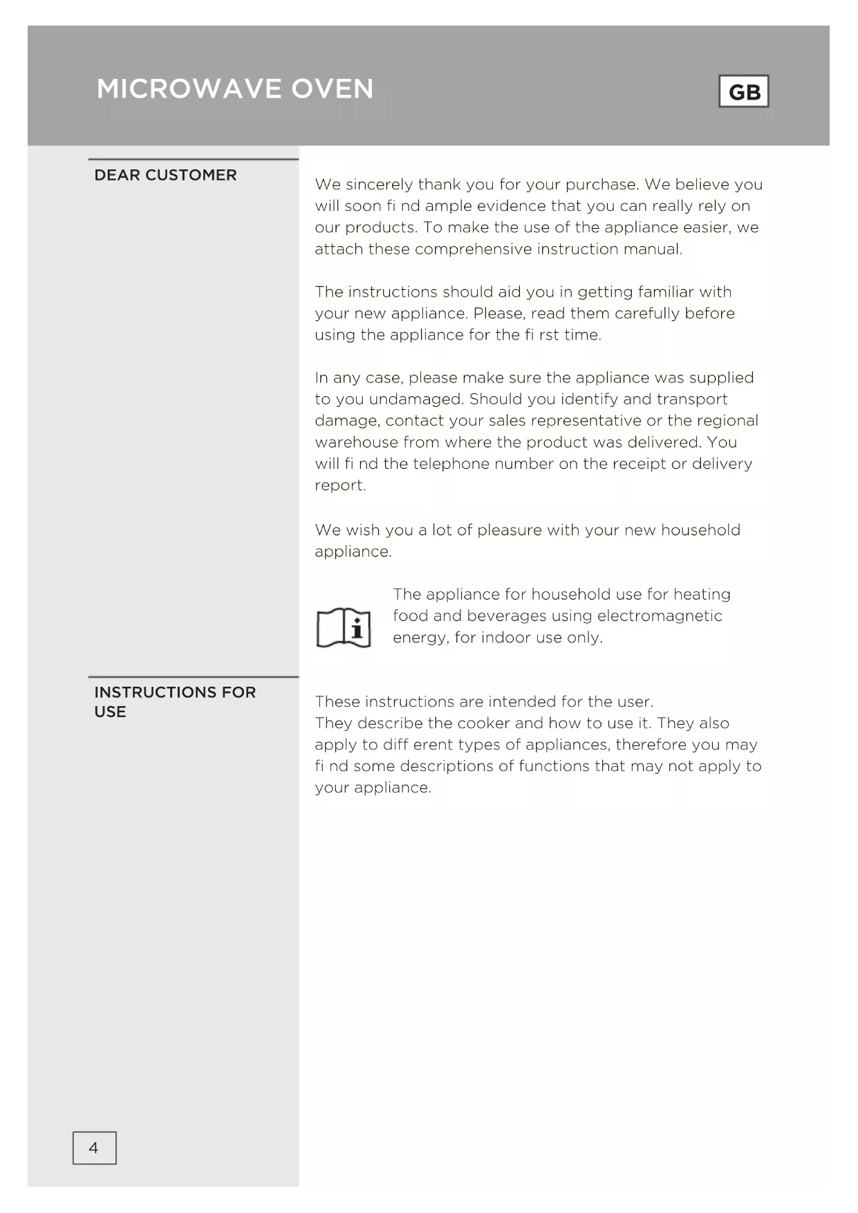 a) Check to see whether the timer is set. b) Check to make sure that the door is securely closed to engage the safety interlocks. Otherwise, the microwave energy will not fl ow into the oven. If none of the above rectify the situation, then contact the nearest authorized service agent. The appliance for household use for heating food and beverages using electromagnetic energy, for indoor use only. If you need information or if you have a problem, please contact the Gorenje Customer Care Centre in your country (you fi nd its phone number in the worldwide guarantee leafl et). If there is no Customer Care Centre in your country, go to your local Gorenje dealer or contact the Service department of Gorenje domestic appliances. For personal use only! Additional recommendations for cooking with microwave and useful advices can be found on web side: http://www.gorenje.com WISHES YOU A LOT OF PLEASURE WHILE USING YOUR APPLIANCE