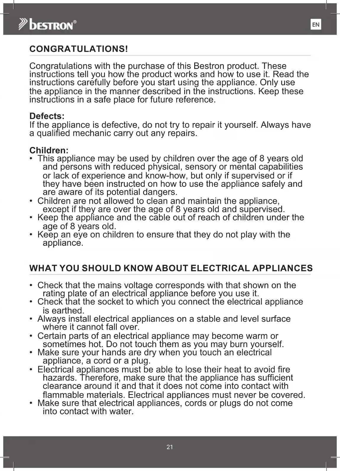 NLCONGRATULATIONS! Congratulations with the purchase of this Bestron product. These instructions tell you how the product works and how to use it. Read the instructions carefully before you start using the appliance. Only use the appliance in the manner described in the instructions. Keep these instructions in a safe place for future reference. Defects: If the appliance is defective, do not try to repair it yourself. Always have a qualified mechanic carry out any repairs. Children: