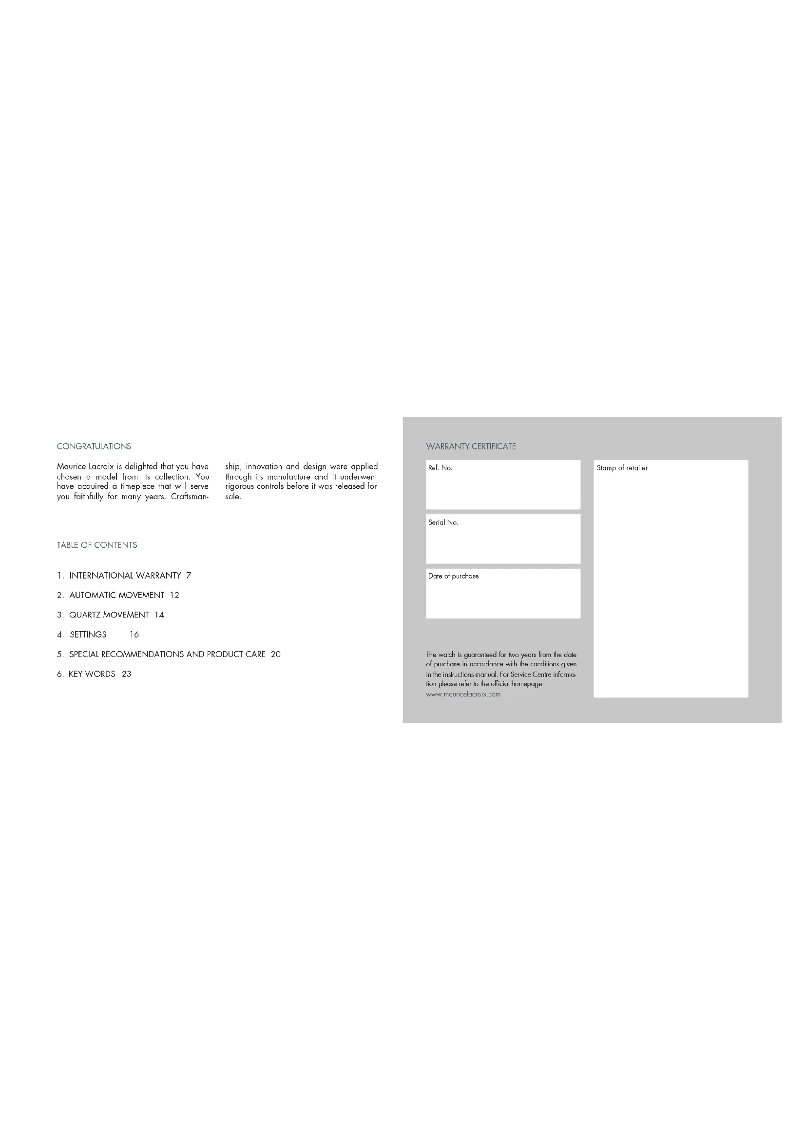 3CONGRATULATIONS Maurice Lacroix is delighted that you have chosen a model from its collection. You have acquired a timepiece that will serve you faithfully for many years. Craftsman- ship, innovation and design were applied through its manufacture and it underwent rigorous controls before it was released for sale. Ref. No. Serial No. Date of purchase Stamp of retailer WARRANTY CERTIFICATE The watch is guaranteed for two years from the date of purchase in accordance with the conditions given in the instructions manual. For Service Centre informa- tion please refer to the official homepage: www.mauricelacroix.com