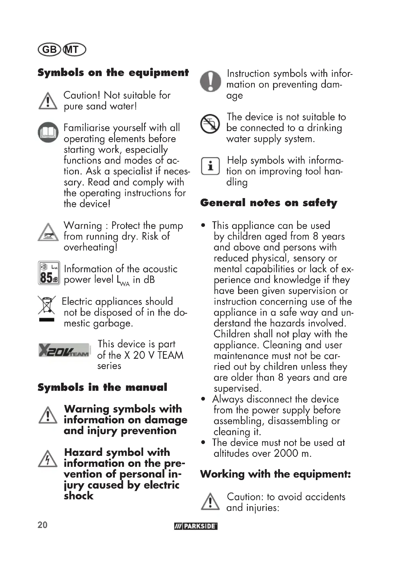 Performance data Max. pressure (bar) Battery type ECO I II 2 Ah 0.9 1.7 2.6 4 Ah 0.9 1.8 2.6 8 Ah 0.9 1.8 2.6 Use time (min) Battery type ECO I II 2 Ah 78 37 18 4 Ah 155 80 40 8 Ah 300 145 70 Delivery rate (l/min) Battery type ECO I II 2 Ah 40 48 50 4 Ah 41 48 50 8 Ah 41 50 50 Tighter suction hoses can reduce the output. Notes on Safety This section deals with the general safety regulations for working with the equipment.20 GB MT Symbols on the equipment Caution! Not suitable for pure sand water! Familiarise yourself with all operating elements before starting work, especially functions and modes of ac- tion. Ask a specialist if neces- sary. Read and comply with the operating instructions for the device!