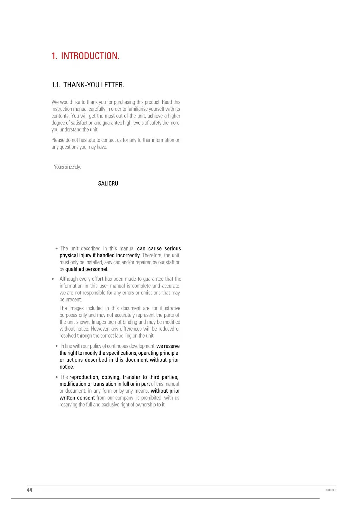 1.1. THANK-YOU LETTER. We would like to thank you for purchasing this product. Read this instruction manual carefully in order to familiarise yourself with its contents. You will get the most out of the unit, achieve ahigher degree of satisfaction and guarantee high levels of safety the more you understand the unit. Please do not hesitate to contact us for any further information or any questions you may have. Yours sincerely,