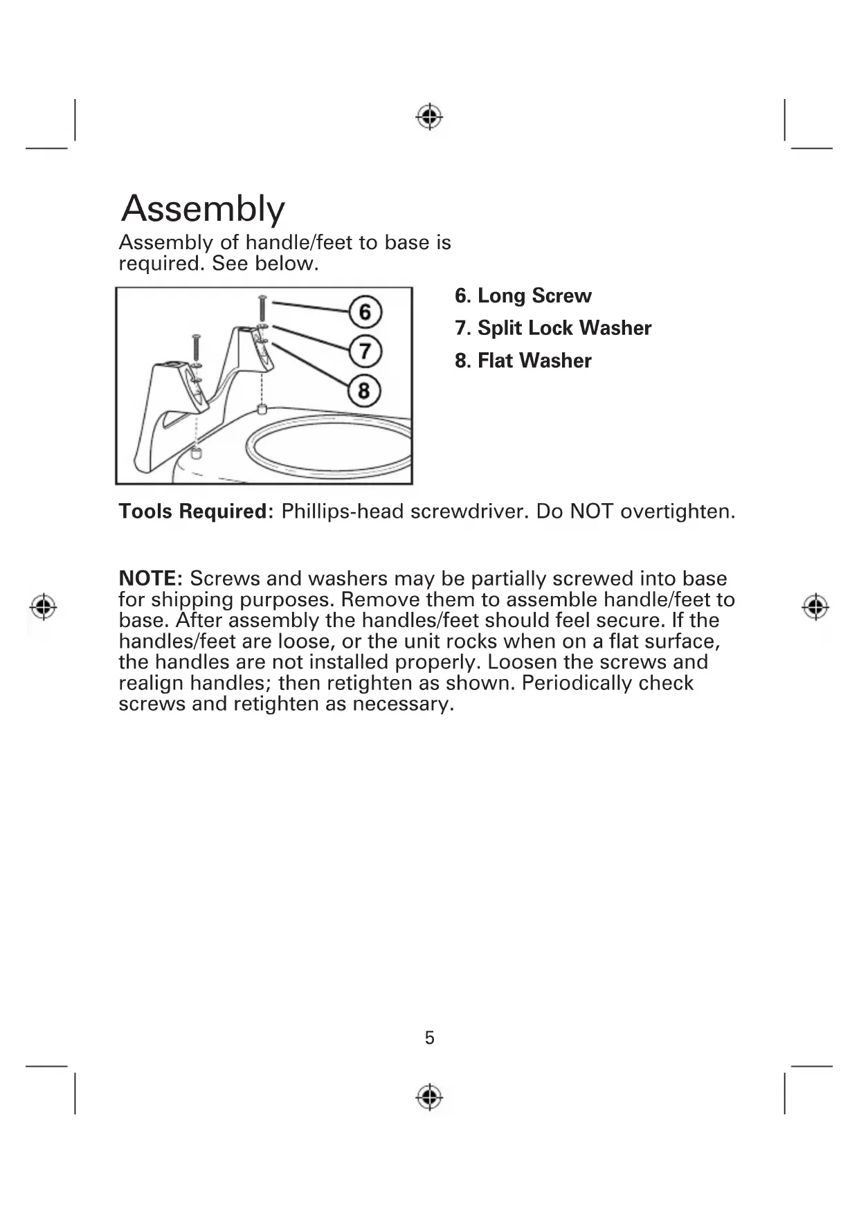 To order parts: hamiltonbeach.com5 Tools Required: Phillips-head screwdriver. Do NOT overtighten. Assembly of handle/feet to base is required. See below. NOTE: Screws and washers may be partially screwed into base for shipping purposes. Remove them to assemble handle/feet to base. After assembly the handles/feet should feel secure. If the handles/feet are loose, or the unit rocks when on a flat surface, the handles are not installed properly. Loosen the screws and realign handles; then retighten as shown. Periodically check screws and retighten as necessary. Assembly