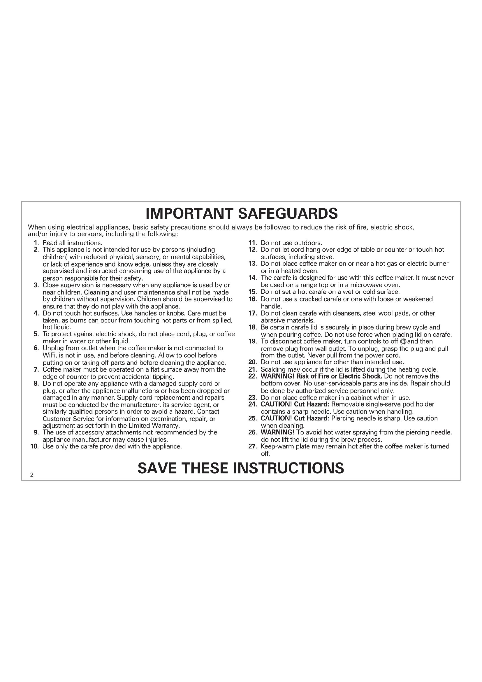 - Occasionally, there maybe a short pause in Alexa capability due to system maintenance.10 Care and Cleaning w WARNING Electrical Shock Hazard. Do not immerse cord, plug, or coffee maker in any liquid. w WARNING Burn Hazard. Failure to allow coffee maker to cool down may cause hot water or coffee to spray from the piercing needle. Use caution when cleaning. w CAUTION Cut Hazard. Removable single-serve pod holder has a sharp needle. Piercing needle on underside of lid also is sharp. Use caution when handling. To Clean Carafe Side: