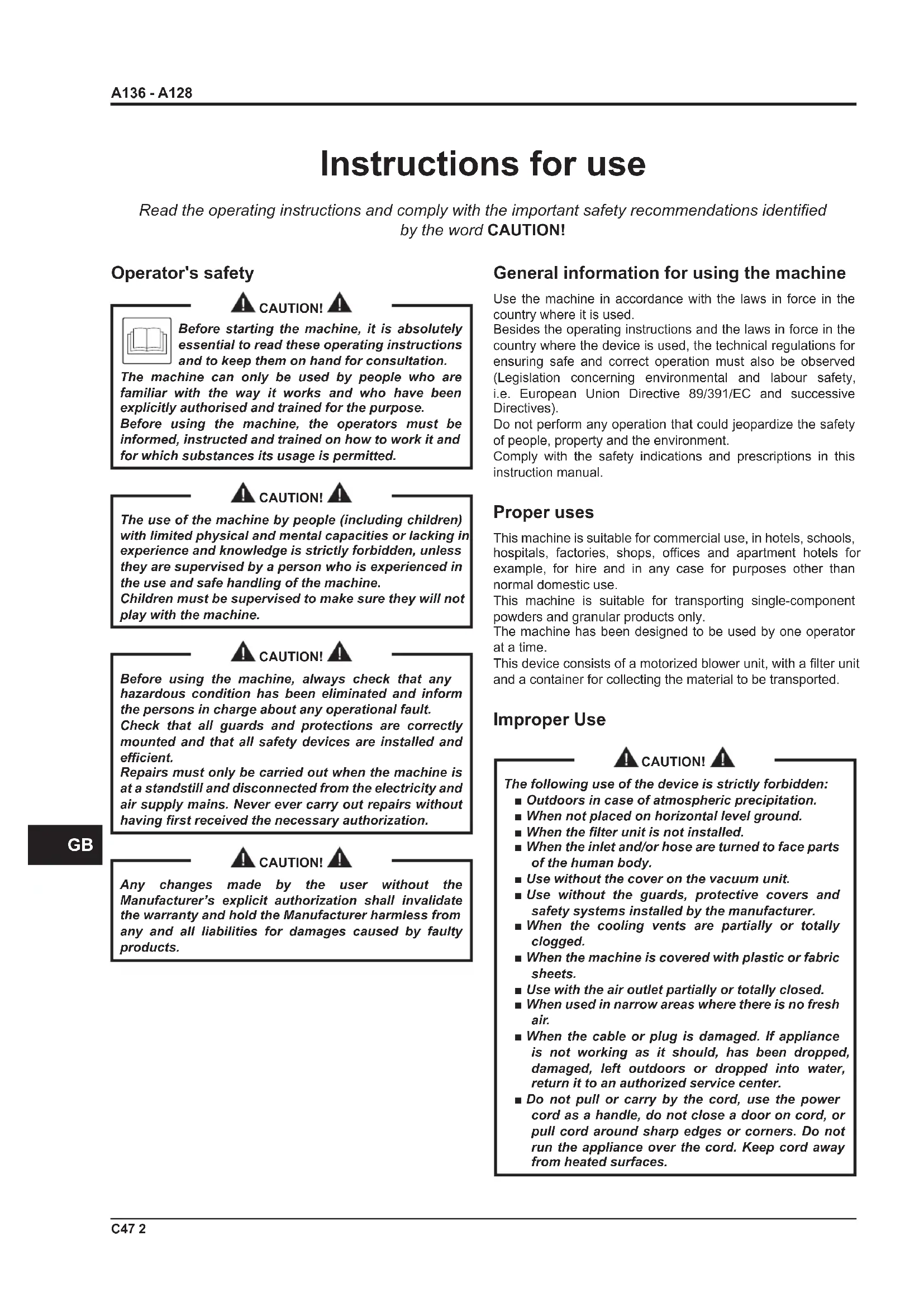 Instructions for use General information for using the machine Use the machine in accordance with the laws in force in the country where it is used. Besides the operating instructions and the laws in force in the country where the device is used, the technical regulations for ensuring safe and correct operation must also be observed (Legislation concerning environmental and labour safety, i.e. European Union Directive 89/391/EC and successive Directives). Do not perform any operation that could jeopardize the safety of people, property and the environment. Comply with the safety indications and prescriptions in this instruction manual. Proper uses This machine is suitable for commercial use, in hotels, schools, hospitals, factories, shops, oces and apartment hotels for example, for hire and in any case for purposes other than normal domestic use. This machine is suitable for transporting single-component powders and granular products only. The machine has been designed to be used by one operator at a time. This device consists of a motorized blower unit, with a lter unit and a container for collecting the material to be transported. Improper Use CAUTION! The following use of the device is strictly forbidden: ■ Outdoors in case of atmospheric precipitation. ■ When not placed on horizontal level ground. ■ When the lter unit is not installed. ■ When the inlet and/or hose are turned to face parts of the human body. ■ Use without the cover on the vacuum unit. ■ Use without the guards, protective covers and safety systems installed by the manufacturer. ■ When the cooling vents are partially or totally clogged. ■ When the machine is covered with plastic or fabric sheets. ■ Use with the air outlet partially or totally closed. ■ When used in narrow areas where there is no fresh air. ■ When the cable or plug is damaged. If appliance is not working as it should, has been dropped, damaged, left outdoors or dropped into water, return it to an authorized service center. ■ Do not pull or carry by the cord, use the power cord as a handle, do not close a door on cord, or pull cord around sharp edges or corners. Do not run the appliance over the cord. Keep cord away from heated surfaces. Read the operating instructions and comply with the important safety recommendations identied by the word CAUTION! Operator's safety CAUTION! Before starting the machine, it is absolutely essential to read these operating instructions and to keep them on hand for consultation. The machine can only be used by people who are familiar with the way it works and who have been explicitly authorised and trained for the purpose. Before using the machine, the operators must be informed, instructed and trained on how to work it and for which substances its usage is permitted. CAUTION! The use of the machine by people (including children) with limited physical and mental capacities or lacking in experience and knowledge is strictly forbidden, unless they are supervised by a person who is experienced in the use and safe handling of the machine. Children must be supervised to make sure they will not play with the machine. CAUTION! Before using the machine, always check that any hazardous condition has been eliminated and inform the persons in charge about any operational fault. Check that all guards and protections are correctly mounted and that all safety devices are installed and ecient. Repairs must only be carried out when the machine is at a standstill and disconnected from the electricity and air supply mains. Never ever carry out repairs without having rst received the necessary authorization. CAUTION! Any changes made by the user without the Manufacturer’s explicit authorization shall invalidate the warranty and hold the Manufacturer harmless from any and all liabilities for damages caused by faulty products.A136 - A128 3 C47