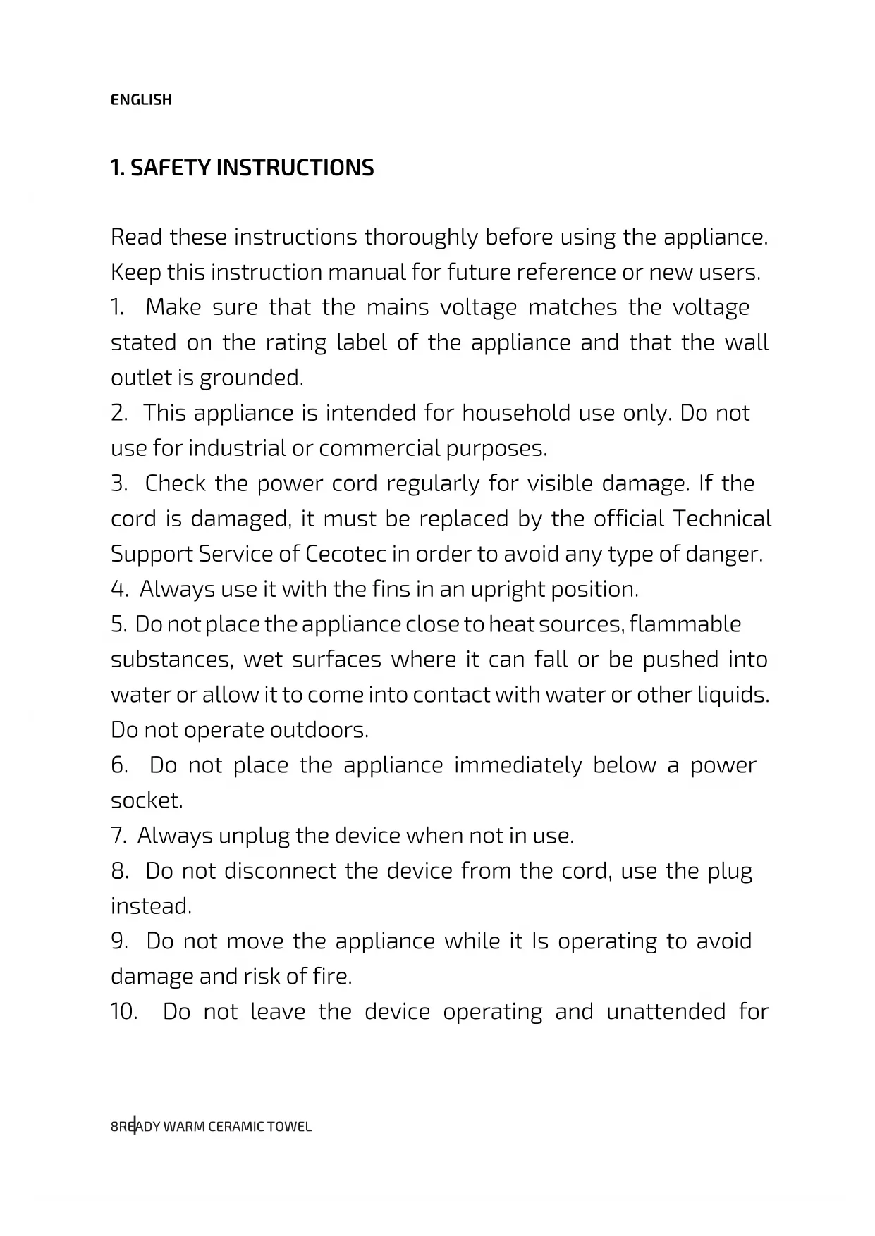 USER MANUAL Ready Warm 9780 Ceramic Towel CECOTEC