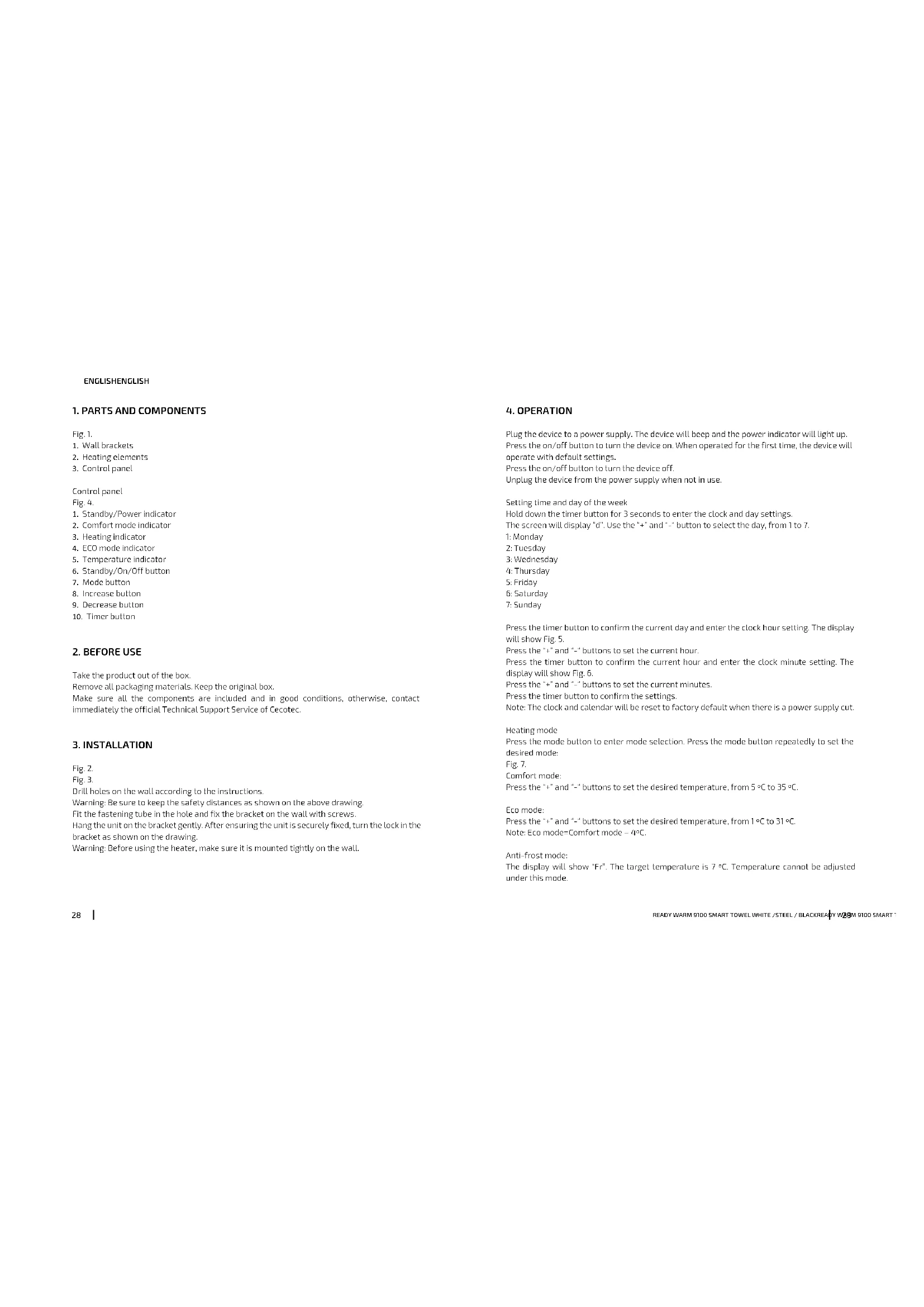 Plug the device to a power supply. The device will beep and the power indicator will light up. Press the on/off button to turn the device on. When operated for the first time, the device will operate with default settings. Press the on/off button to turn the device off. Unplug the device from the power supply when not in use. Setting time and day of the week Hold down the timer button for 3 seconds to enter the clock and day settings. The screen will display “d”. Use the “+” and “-“ button to select the day, from 1 to 7. 1: Monday 2: Tuesday 3: Wednesday 4: Thursday 5: Friday 6: Saturday 7: Sunday Press the timer button to confirm the current day and enter the clock hour setting. The display will show Fig. 5. Press the “+” and “-“ buttons to set the current hour. Press the timer button to confirm the current hour and enter the clock minute setting. The display will show Fig. 6. Press the “+” and “-“ buttons to set the current minutes. Press the timer button to confirm the settings. Note: The clock and calendar will be reset to factory default when there is a power supply cut. Heating mode Press the mode button to enter mode selection. Press the mode button repeatedly to set the desired mode: Fig. 7. Comfort mode: Press the “+” and “-“ buttons to set the desired temperature, from 5 ºC to 35 ºC. Eco mode: Press the “+” and “-“ buttons to set the desired temperature, from 1 ºC to 31 ºC. Note: Eco mode=Comfort mode – 4ºC. Anti-frost mode: The display will show “Fr”. The target temperature is 7 ºC. Temperature cannot be adjusted under this mode.READY WARM 9100 SMART TOWEL WHITE /STEEL / BLACKREADY WARM 9100 SMART TOWEL WHITE /STEEL / BLACK