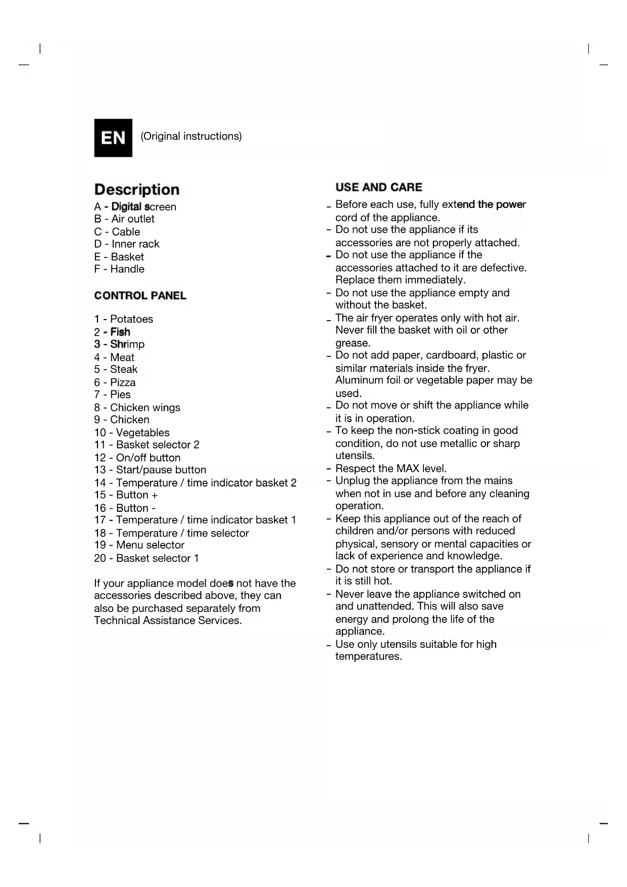 Before each use, fully extend the power cord of the appliance. Do not use the appliance if its accessories are not properly attached. Do not use the appliance if the accessories attached to it are defective. Replace them immediately. Do not use the appliance empty and without the basket. The air fryer operates only with hot air. Never fill the basket with oil or other grease. Do not add paper, cardboard, plastic or similar materials inside the fryer. Aluminum foil or vegetable paper may be used. Do not move or shift the appliance while it is in operation. To keep the non-stick coating in good condition, do not use metallic or sharp utensils. Respect the MAX level. Unplug the appliance from the mains when not in use and before any cleaning operation. Keep this appliance out of the reach of children and/or persons with reduced physical, sensory or mental capacities or lack of experience and knowledge. Do not store or transport the appliance if it is still hot. Never leave the appliance switched on and unattended. This will also save energy and prolong the life of the appliance. Use only utensils suitable for high temperatures.