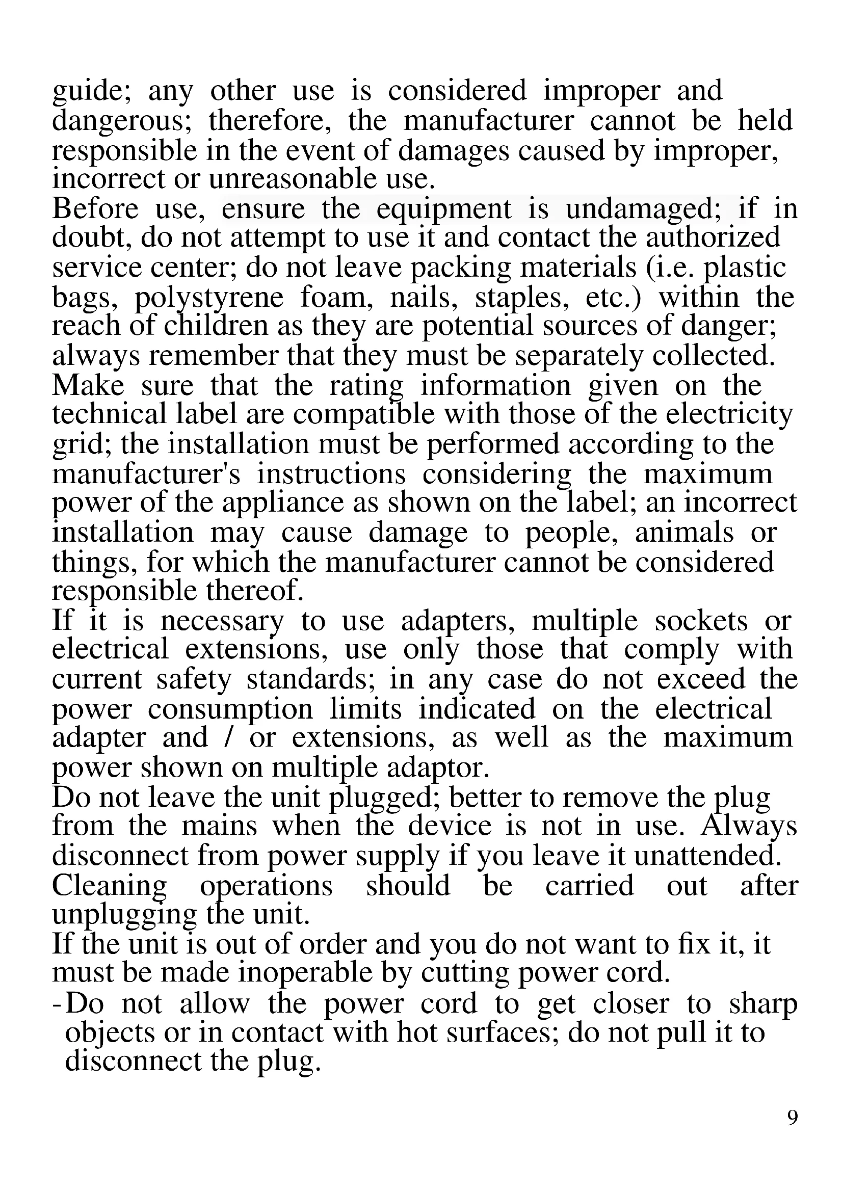 The following are important notes on the installation, use and maintenance; save this instruction manual for future reference; use the equipment only as specified in this9 guide; any other use is considered improper and dangerous; therefore, the manufacturer cannot be held responsible in the event of damages caused by improper, incorrect or unreasonable use. Before use, ensure the equipment is undamaged; if in doubt, do not attempt to use it and contact the authorized service center; do not leave packing materials (i.e. plastic bags, polystyrene foam, nails, staples, etc.) within the reach of children as they are potential sources of danger; always remember that they must be separately collected. Make sure that the rating information given on the technical label are compatible with those of the electricity grid; the installation must be performed according to the manufacturer's instructions considering the maximum power of the appliance as shown on the label; an incorrect installation may cause damage to people, animals or things, for which the manufacturer cannot be considered responsible thereof. If it is necessary to use adapters, multiple sockets or electrical extensions, use only those that comply with current safety standards; in any case do not exceed the power consumption limits indicated on the electrical adapter and / or extensions, as well as the maximum power shown on multiple adaptor. Do not leave the unit plugged; better to remove the plug from the mains when the device is not in use. Always disconnect from power supply if you leave it unattended. Cleaning operations should be carried out after unplugging the unit. If the unit is out of order and you do not want to fix it, it must be made inoperable by cutting power cord. - Do not allow the power cord to get closer to sharp objects or in contact with hot surfaces; do not pull it to disconnect the plug.10 - Do not use the appliance in the event of damage to the power cord, plug, or in case of short circuits; to repair the product only address an authorized service center. - Do not handle or touch the appliance with wet hands or bare feet. Do not expose the appliance to harmful weather conditions such as rain, moisture, frost, etc.. Always store it in a dry place. - This appliance can be used by children of 8 years and above and persons with reduced physical, sensory or mental capabilities or lack of experience and knowledge if they received supervision or instruction concerning use of the appliance in a safe way and understand hazards involved; children shall not play with the appliance; cleaning and user maintenance shall not be made by children without supervision. - Children must not play with the appliance. - Keep the appliance and its cord out of reach of children less than 8 years. If the power cord is damaged, or in case of failure and / or malfunction do not tamper with the unit. The reparation must be done by manufacturer or by service center authorized by the manufacturer in order to prevent any risk. Failure to comply with the above may compromise the unit safety and invalidate the warranty.