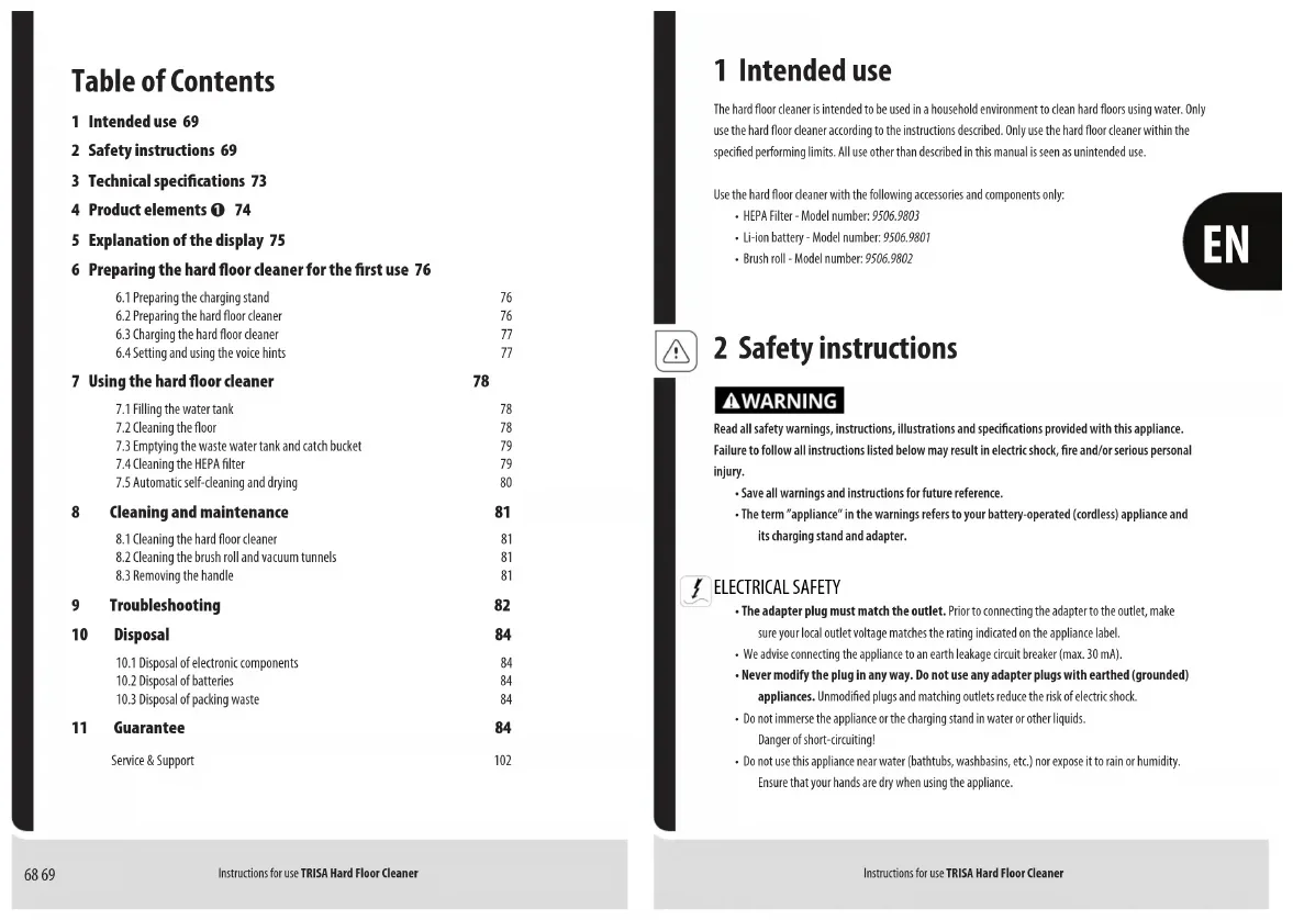 - The adapter plug must match the outlet. Prior to connecting the adapter to the outlet, make sure your local outlet voltage matches the rating indicated on the appliance label.• We advise connecting the appliance to an earth leakage circuit breaker (max. 30 mA).• Never modify the plug in any way. Do not use any adapter plugs with earthed (grounded) appliances. Unmodied plugs and matching outlets reduce the risk of electric shock.• Do not immerse the appliance or the charging stand in water or other liquids. Danger of short-circuiting!• Do not use this appliance near water (bathtubs, washbasins, etc.) nor expose it to rain or humidity. Ensure that your hands are dry when using the appliance. 1 Intended use 69 2 Safety instructions 69 3 Technical specifications 73 4 Product elements ➊ 74 5 Explanation of the display 75 6 Preparing the hard floor cleaner for the first use 76 6.1 Preparing the charging stand 766.2 Preparing the hard oor cleaner 766.3 Charging the hard oor cleaner 776.4 Setting and using the voice hints 77 7 Using the hard floor cleaner 78 7.1 Filling the water tank 787.2 Cleaning the oor 787.3 Emptying the waste water tank and catch bucket 797.4 Cleaning the HEPA lter 797.5 Automatic self-cleaning and drying 80 8 Cleaning and maintenance 81