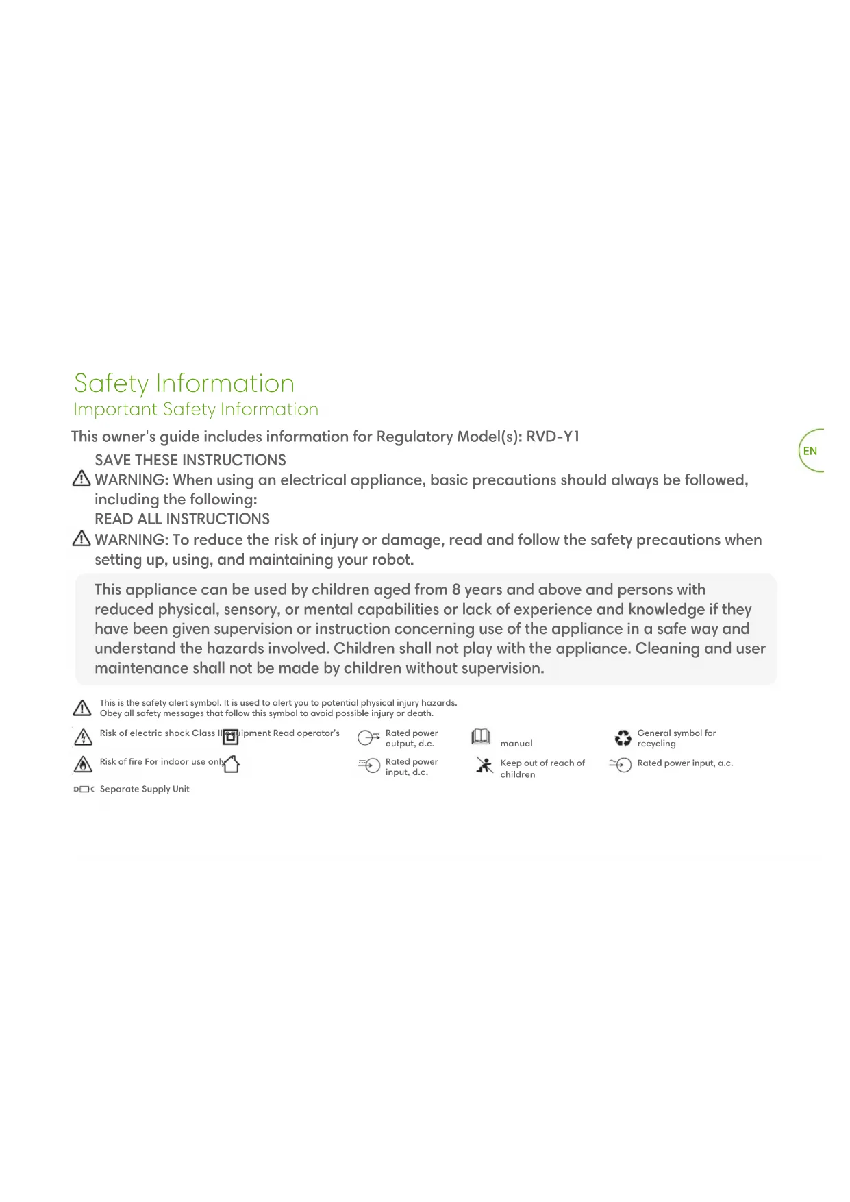 Risk of electric shock Class II equipment Read operator’s manual Risk of fire For indoor use only Keep out of reach of children General symbol for recycling Rated power input, d.c. Rated power output, d.c. Separate Supply Unit This owner's guide includes information for Regulatory Model(s): RVD-Y1 Rated power input, a.c.EN CAUTION