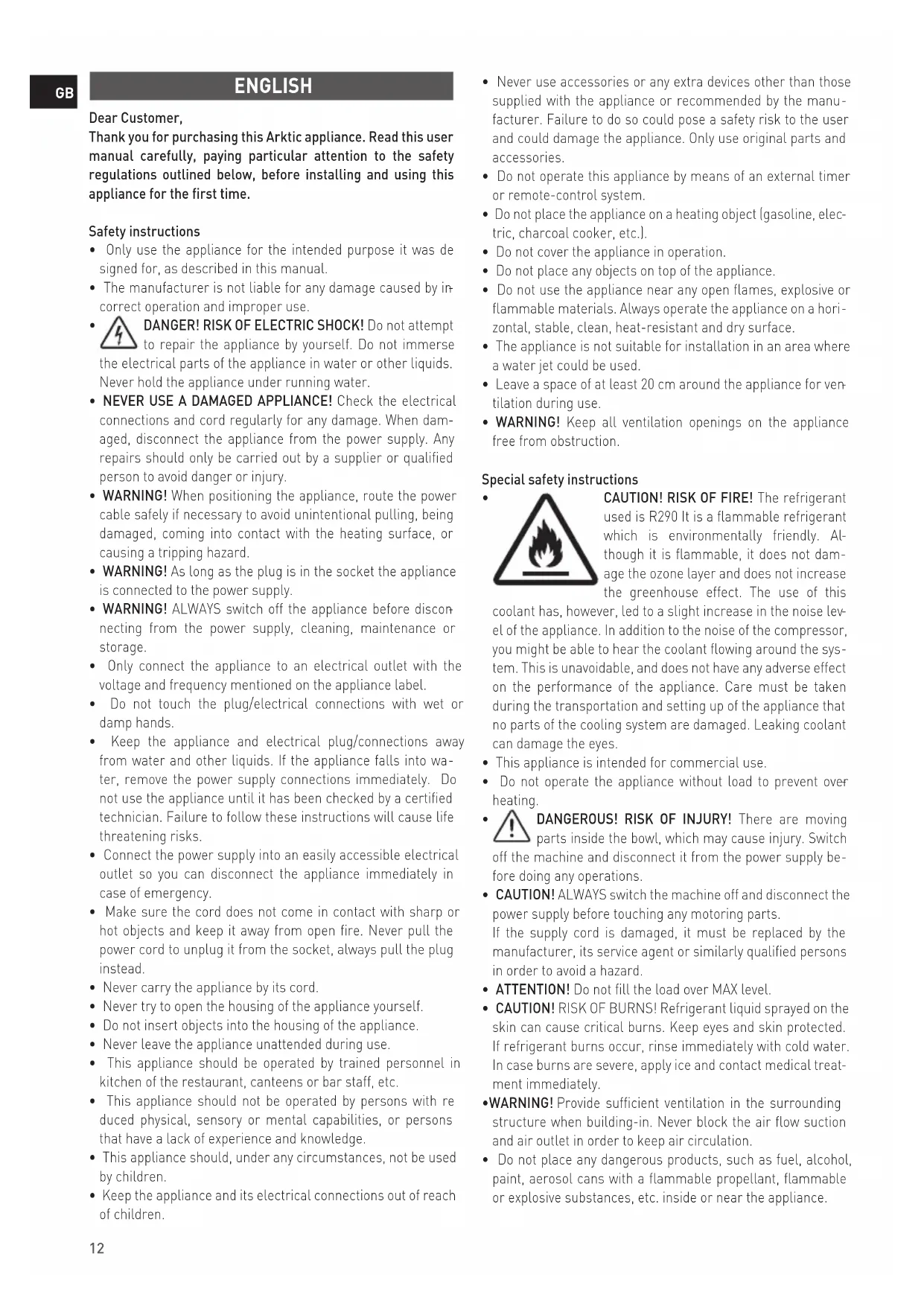 ENGLISH Dear Customer, Thank you for purchasing this Arktic appliance. Read this user manual carefully, paying particular attention to the safety regulations outlined below, before installing and using this appliance for the first time. Safety instructions