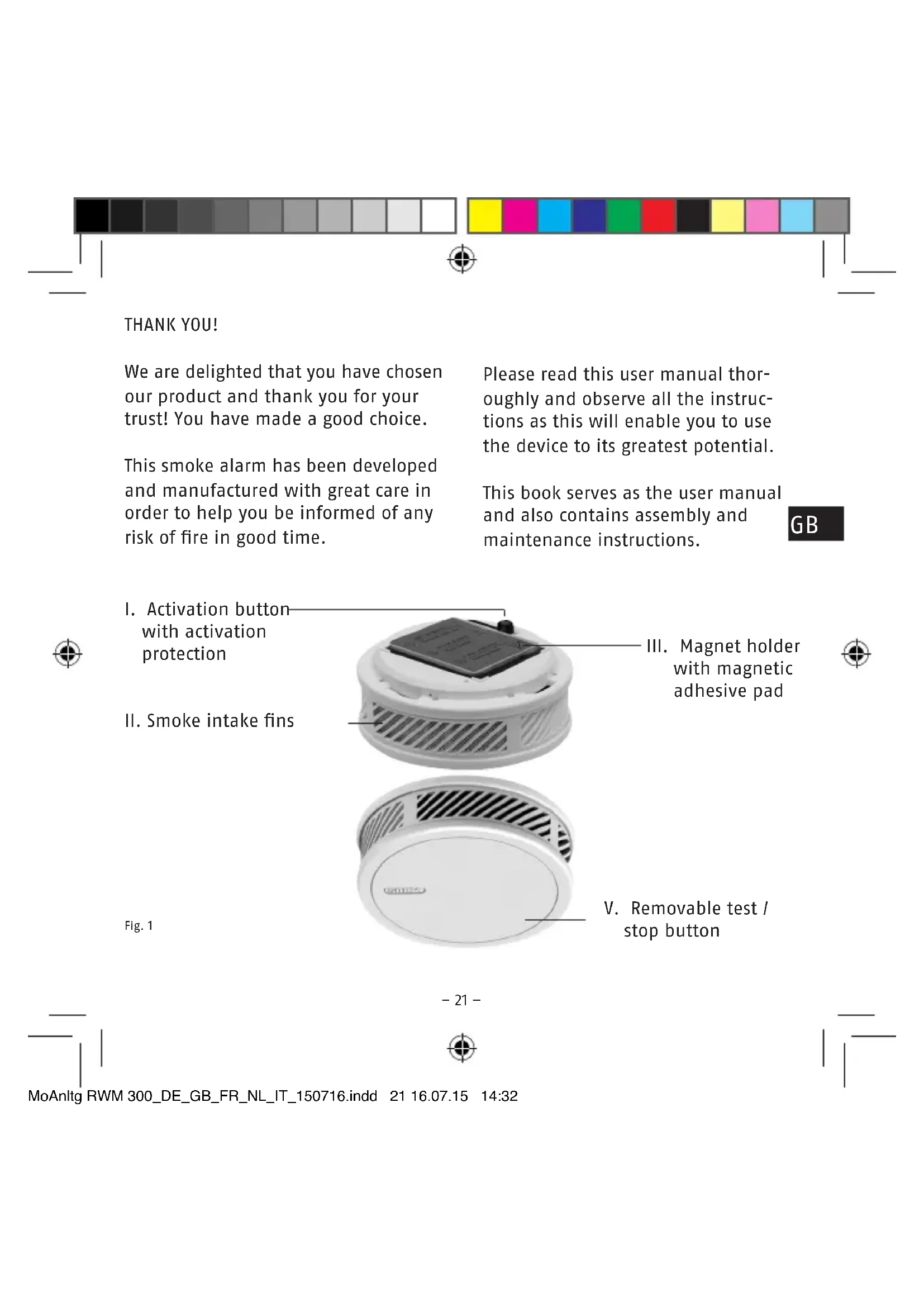 DISPOSAL 34 Possible damage to property Note on the installation MoAnltg RWM 300_DE_GB_FR_NL_IT_150716.indd 20 16.07.15 14:32– 20 – – 21 – THANK YOU! We are delighted that you have chosen our product and thank you for your trust! You have made a good choice. This smoke alarm has been developed and manufactured with great care in order to help you be informed of any risk of re in good time. Please read this user manual thor- oughly and observe all the instruc- tions as this will enable you to use the device to its greatest potential. This book serves as the user manual and also contains assembly and maintenance instructions.